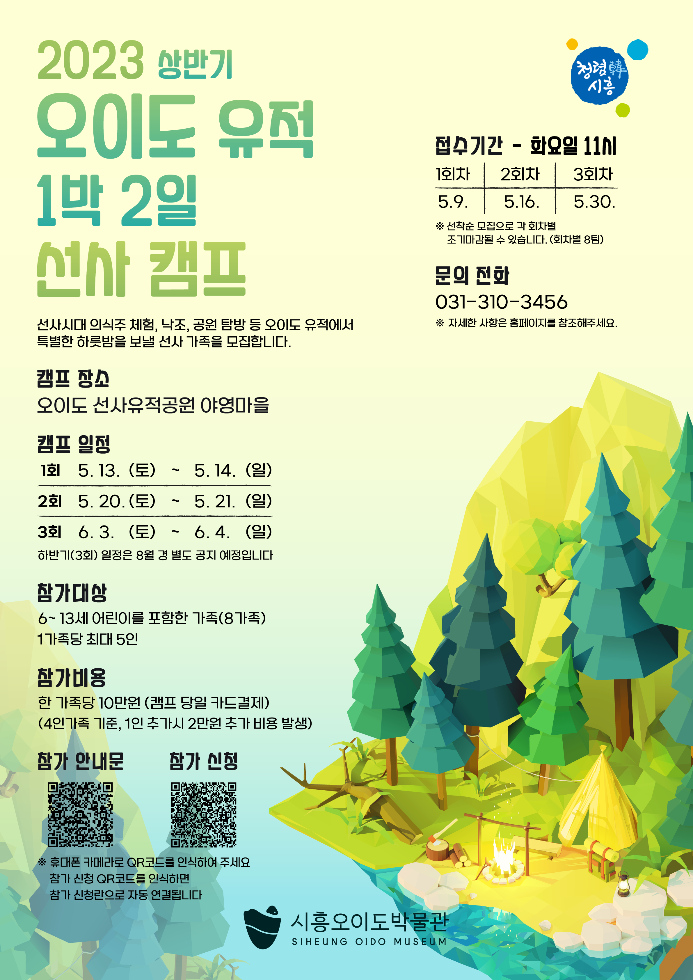 시흥시(시장 임병택)가 나들이하기 좋은 계절을 맞아 5월 13일부터 6월 4일까지 오이도 선사유적공원 야영마을에서 특별한 하룻밤을 보낼 수 있는 ‘2023 상반기 오이도 유적 1박 2일 선사캠프’를 운영한다.