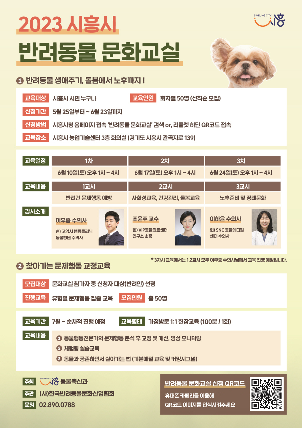 지역 내 반려동물을 키우거나 관심 있는 시민 150명(회차별 50명)을 선착순으로 모집한다. 시흥시청 홈페이지에서 ‘반려동물 문화교실’ 을 검색하거나 홍보물 QR코드로 신청할 수 있다. 1인 1강좌만 수강 가능하다.