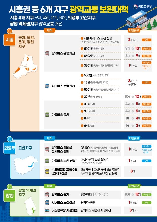 광역교통 개선 내용을 살펴보면, 은계~목감~판교노선, 장현~목감~판교 노선 등 광역버스 2개 노선(각 4대)이 신설된다. 또한, ▲6501번과 6502번 광역버스 각 1대 증차 ▲3301번 출근 1회 증회 ▲시내버스 3개 노선의 운행 개시 ▲27번 2대 증차 ▲마을버스 4개 노선에서 6대의 증차가 추진된다.
