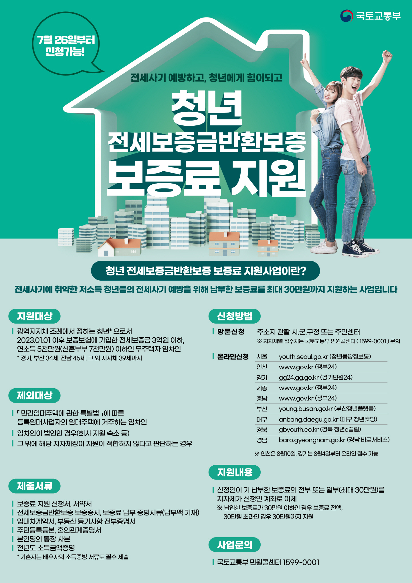 이번 사업은 전세 사기 등 전세 피해를 예방하기 위해 청년들의 전세보증금 반환보증 가입을 유도하기 위한 것으로, 가입자가 실제 납부한 보증료를 최대 30만 원 한도로 환급한다.