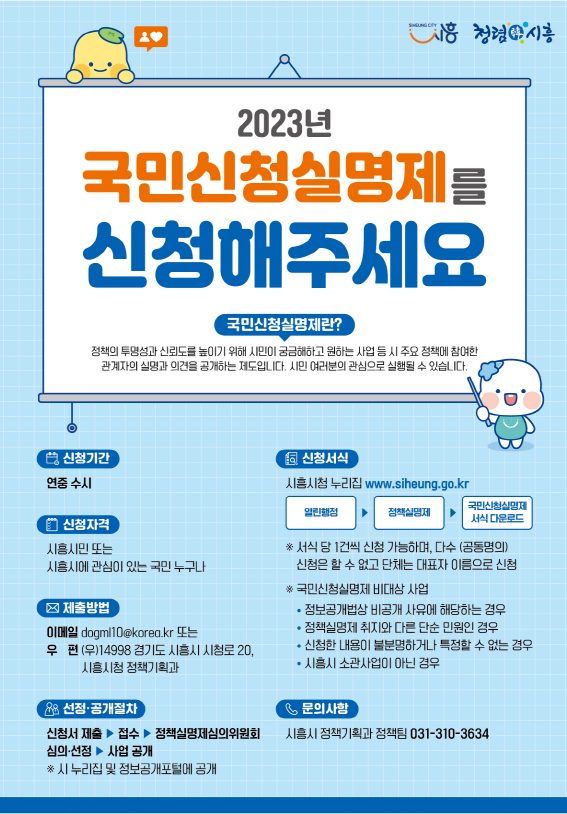 자세한 사항은 시흥시청 누리집 또는 시흥시청 정책기획과(031-310-3634)로 문의하면 된다.