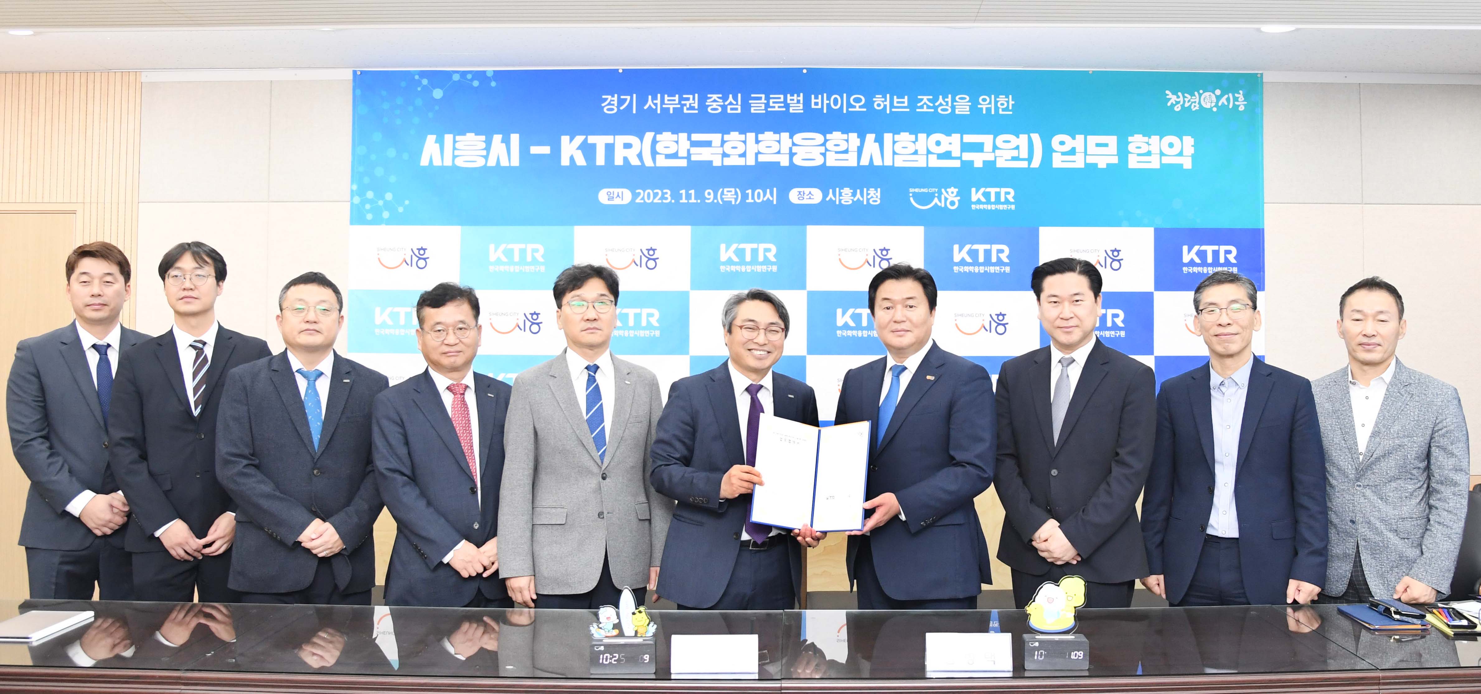 시흥시(시장 임병택)는 9일 시청 다슬방에서 세계적 시험인증기관인 한국화학융합시험연구원(원장 김현철/이하KTR)과 경기 서부권 글로벌 바이오 허브 조성을 위한 업무 협약을 체결했다.