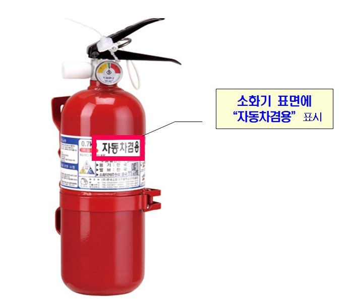 한편 차량용 소화기는 일반분말소화기의 성능시험뿐만 아니라 진동시험과 고온시험으로 부품이탈·파손·변형 등 손상이 없는 것까지 검증된 소화기를 의미하며, 소화기 용기 표면에 ‘자동차 겸용’ 표시가 돼 있다.