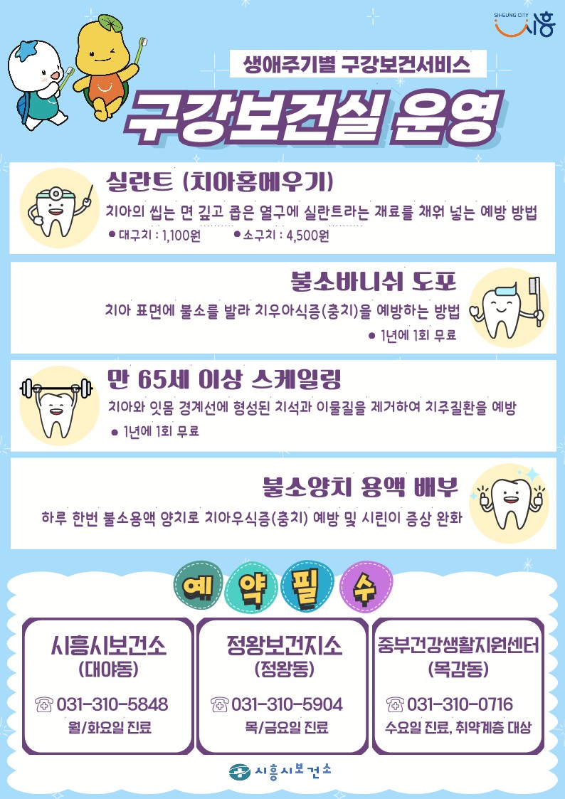 시흥시보건소 구강보건실에서는 만 65세 이상 노인을 대상으로 스케일링을 무료로 실시하고 있으며, 어린이와 청소년을 대상으로 충치 예방에 효과적인 치아 홈 메우기와 불소바니쉬 도포를 진행하고 있다.