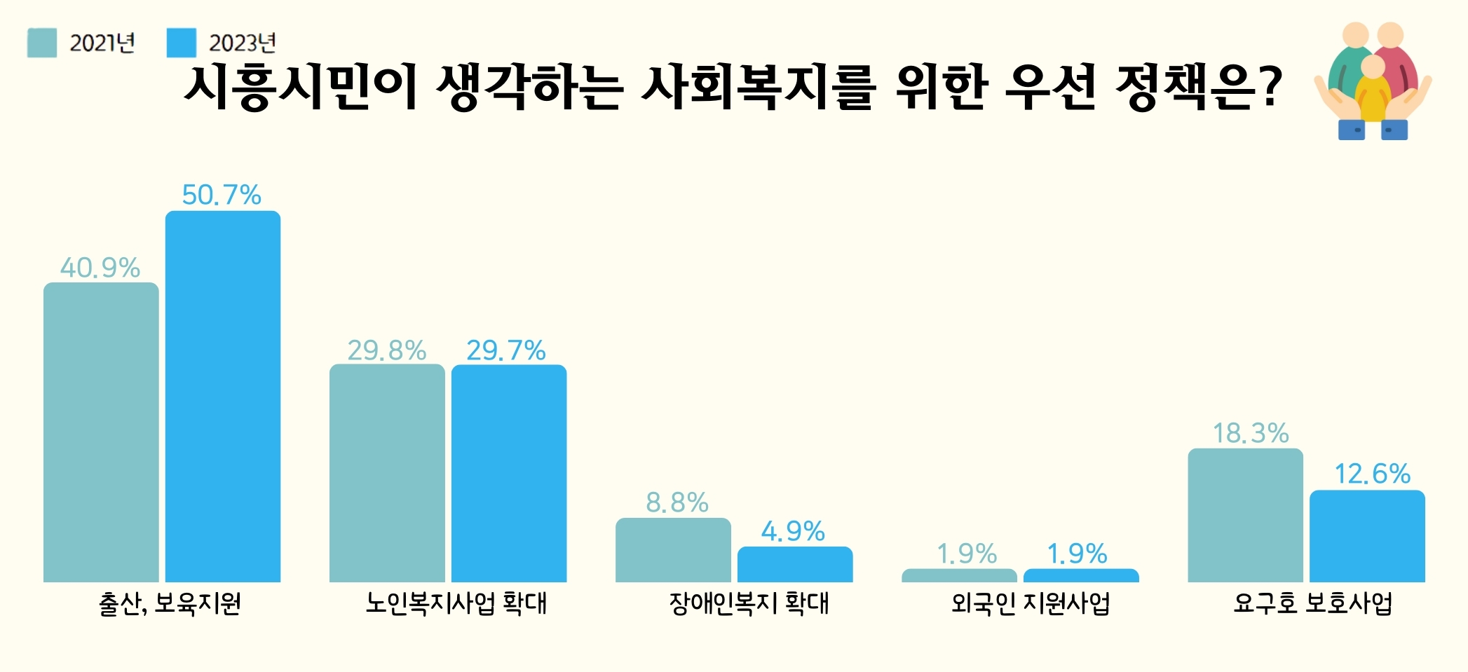 특히 출산보육 지원 정책에 관한 관심은 2021년에 비해 약 10% 증가했다이러한 인식을 반영해 시흥시는 민선 8기 공약사항인 ‘산후조리 공공서비스 지원’ 강화 방안으로 2024년부터는 산후 조리비 및 출생 축하금을 신규 지원하는 등 출산 지원 정책을 확대 추진하고 있다.