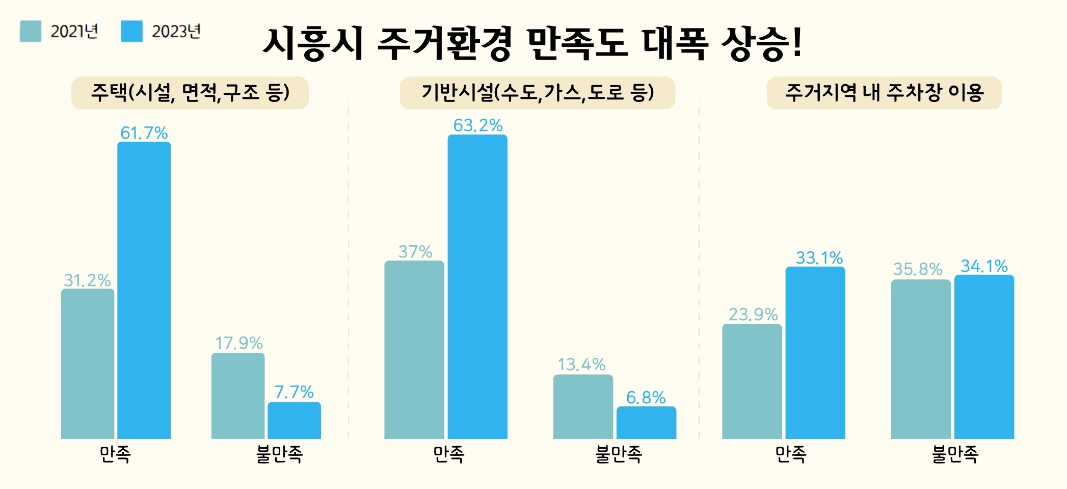 ‘주거환경 만족도’란 현재 거주하는 주택 주변의 물리적사회적문화적 그리고 자연환경 같은 주거환경에 대한 만족감을 거주자의 주관적 평가로 측정하는 주거의 질 지표다이러한 주거환경 만족도가 대폭 상승한 것은 생활 기반방범 상태위생 환경교육 환경 등 복합적인 요소로 이뤄진 주거의 질을 높이는 시흥시의 다양한 정책과 노력의 결과로 해석된다.