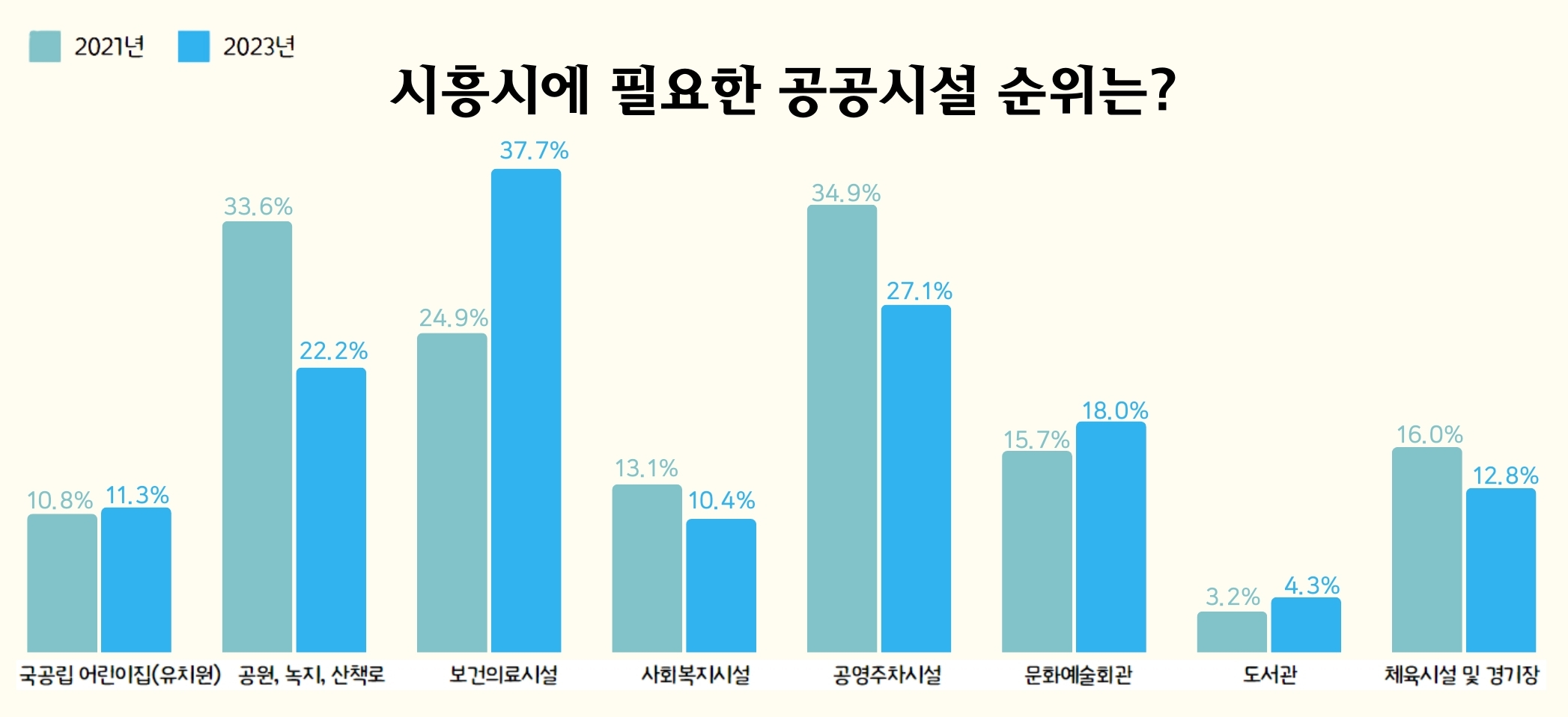 시흥배곧서울대병원(가칭)이 들어서면 보건의료시설에 대한 시민의 요구가 해소될 것으로 예상된다또한, 2021년은 ‘공영주차시설’이 34.9%, ‘공원녹지산책로’가 33.6%로 1, 2위를 차지했다.