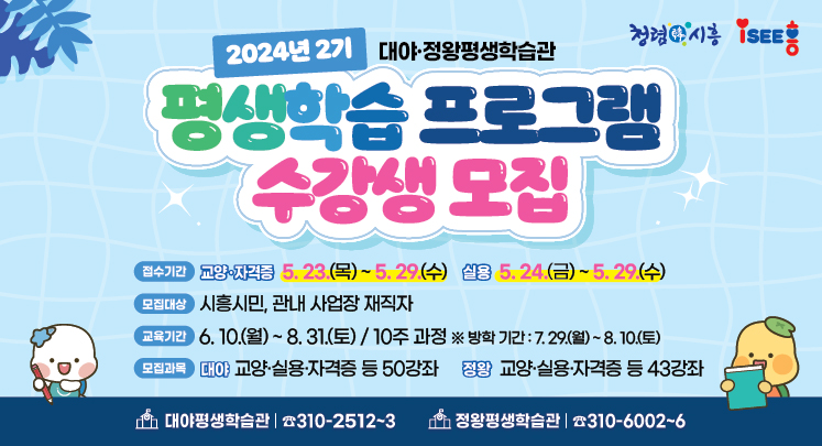 시흥시(시장 임병택) 대야ㆍ정왕평생학습관은 오는 5월 23일부터 29일까지 ‘2024년 2기 정규과정 평생학습 프로그램’ 수강생을 모집한다.