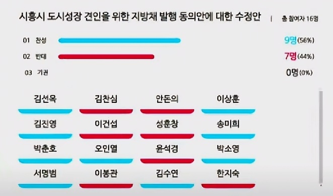 한편, 자치행정위를 통과한 시흥시 지방채 발행 수정안은 토론 후 표결한 결과 찬성 9명, 반대 7명으로 본회의를 통과했다.