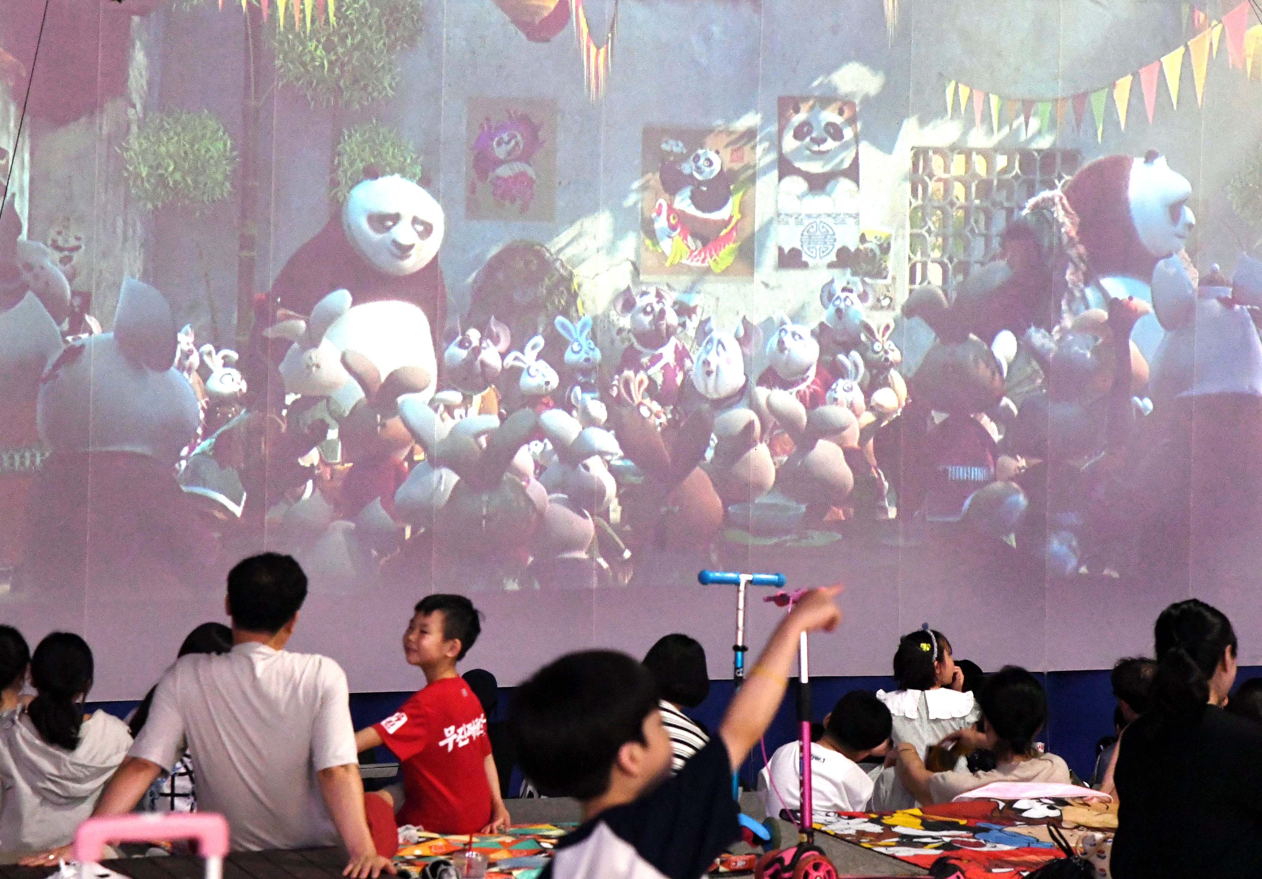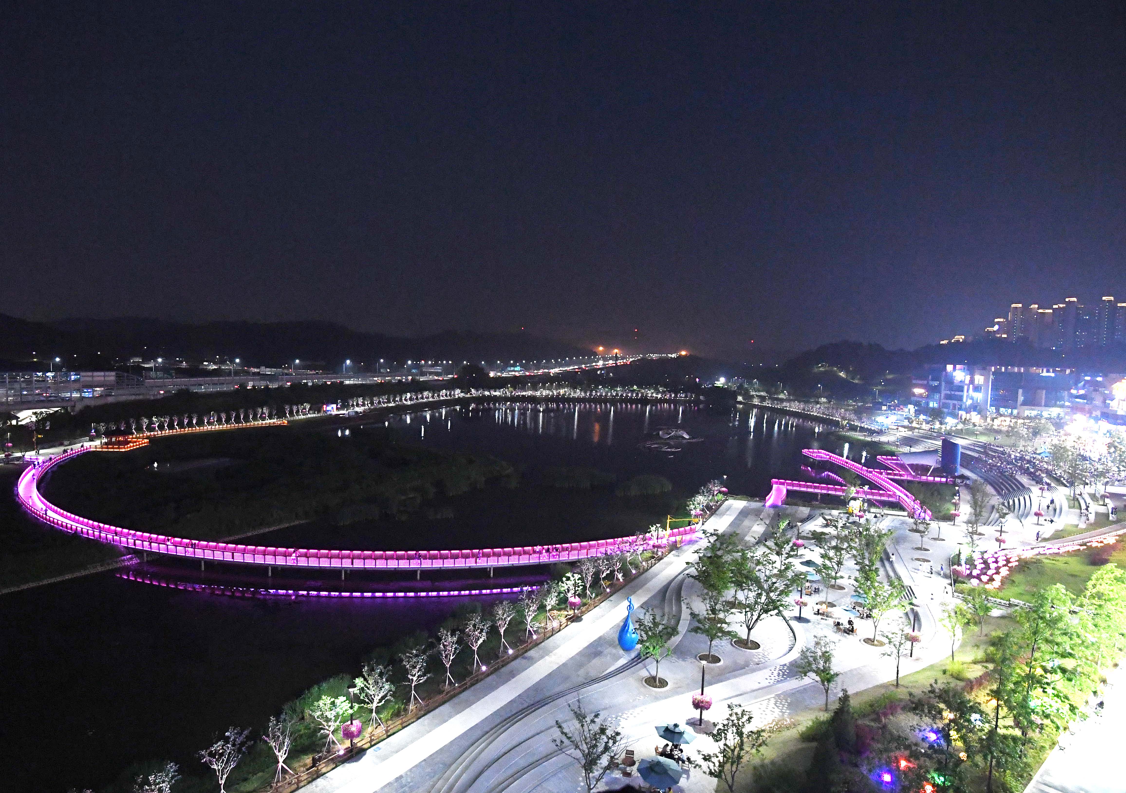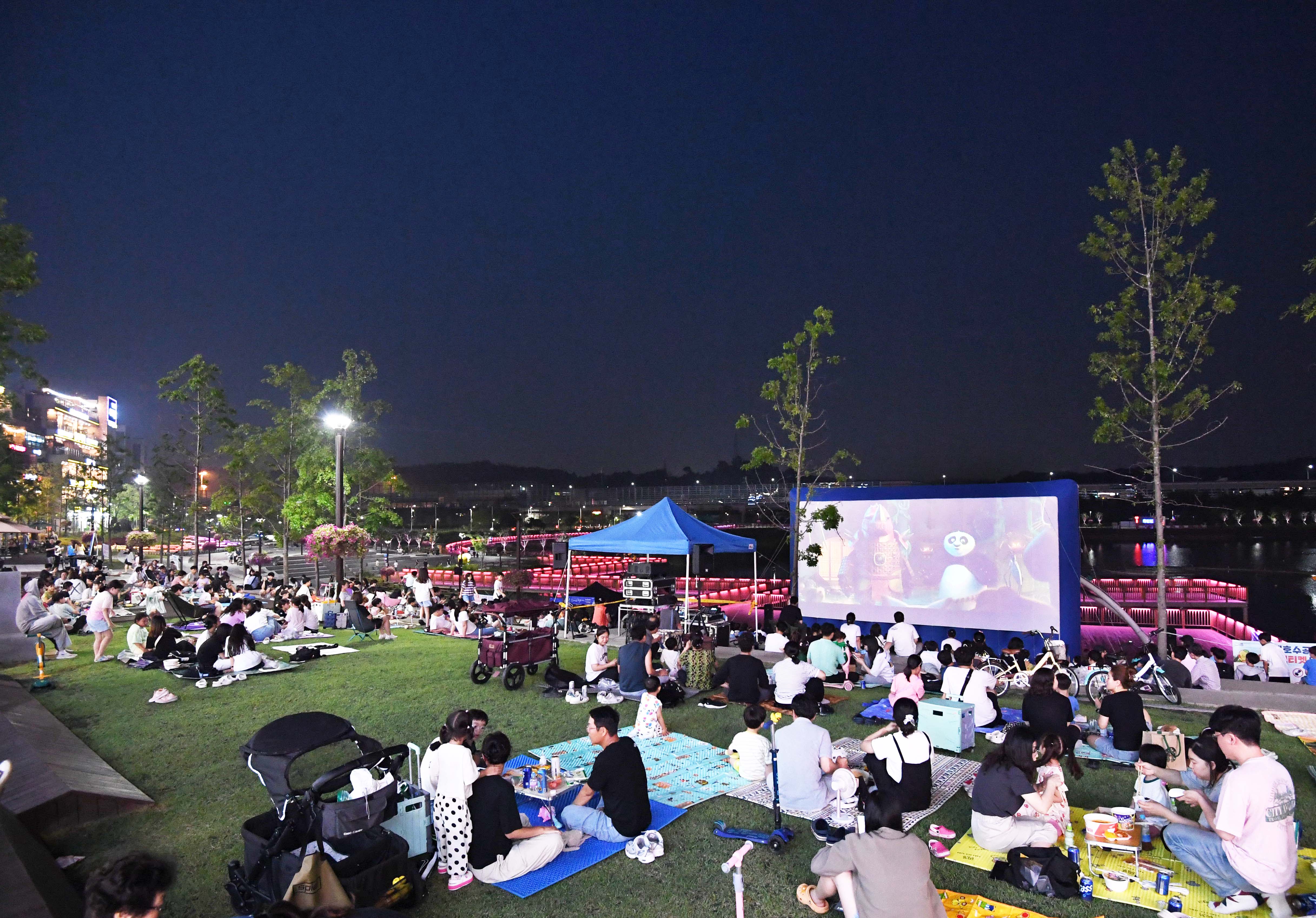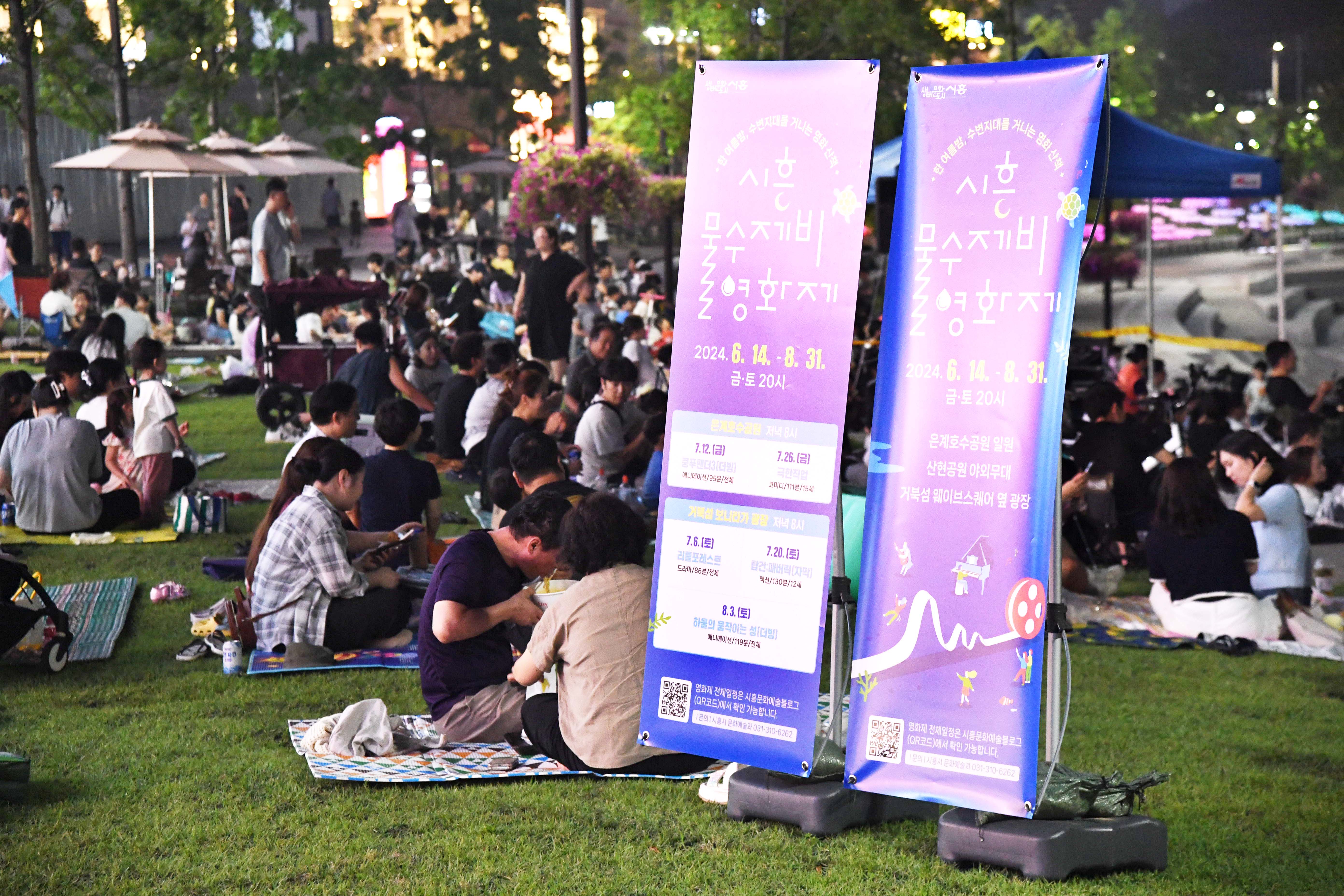 한여름 밤, 호숫가를 가로지르는 나무 덱이 수려한 불빛으로 반짝이는 시흥 은계호수공원. 가족들과 산책 나온 시민들이 돗자리를 펴고 옹기종기 모여 앉아 스크린에서 상영 중인 영화 속으로 빠져든다.