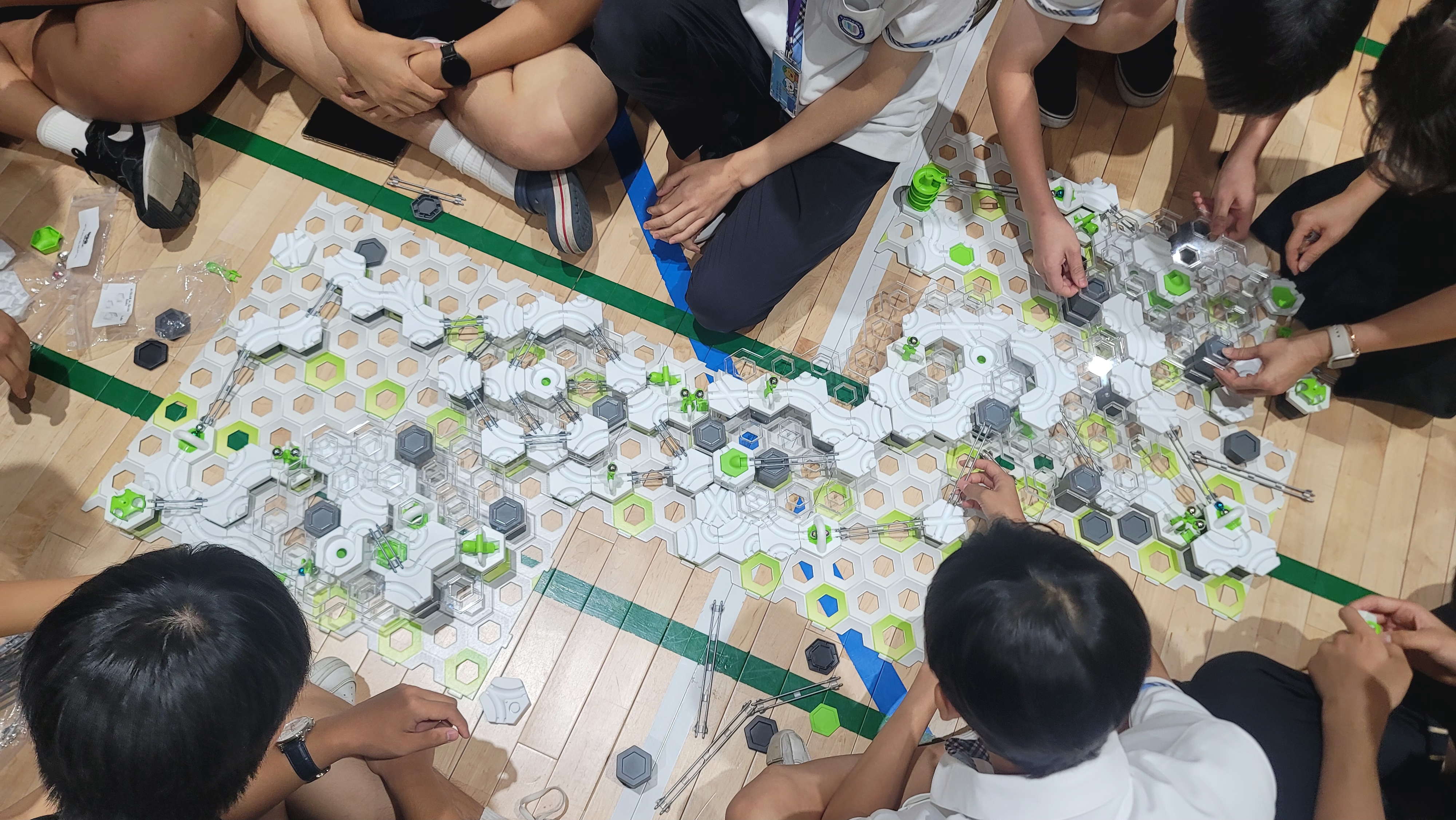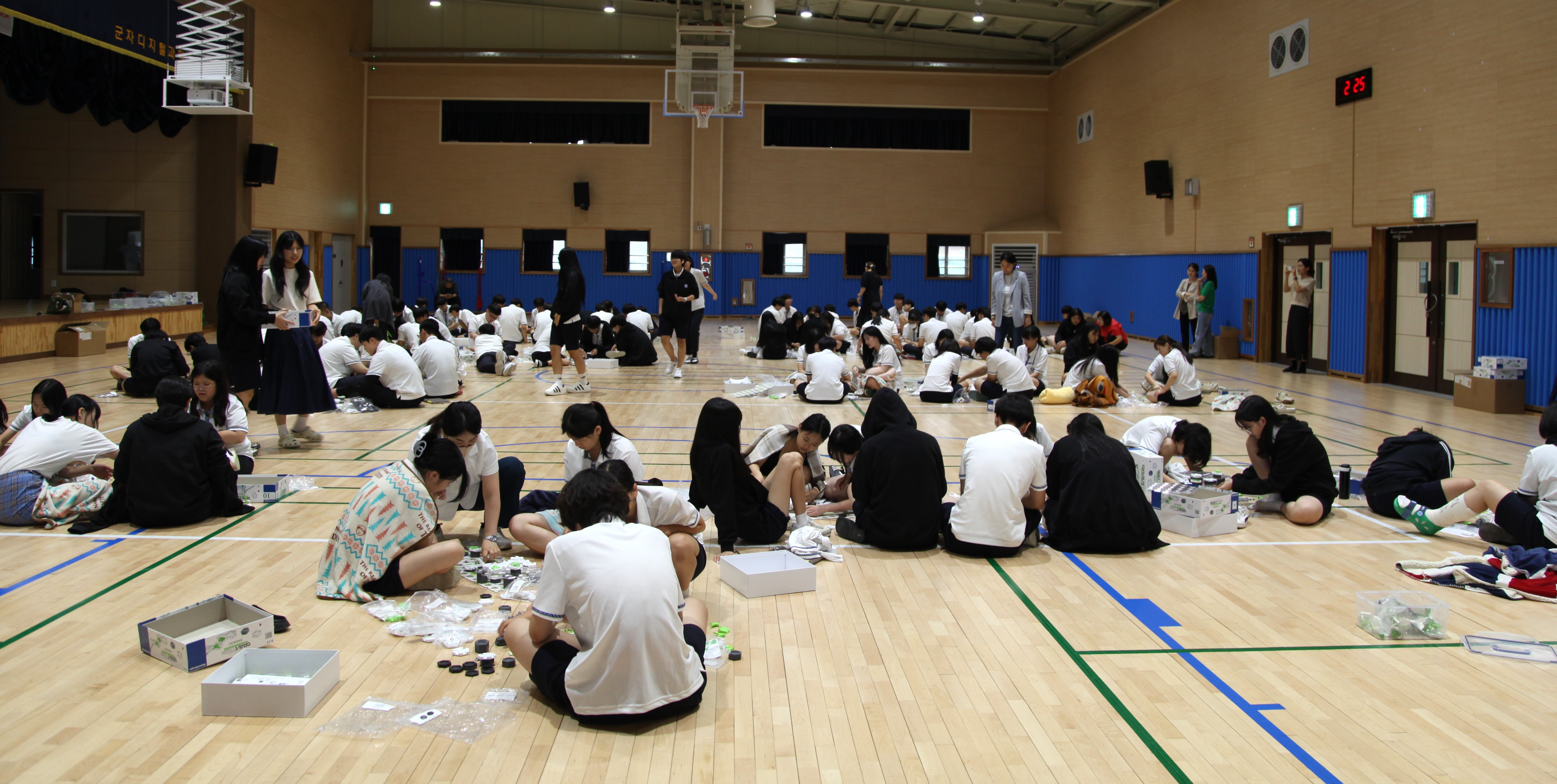 점심시간이 지난 후 체육관에 모인 1학년 학생들은 그래비트랙스 대회를 열었다. 수업시간에 배운 그래비트랙스를 모둠별로 완성하고 이것을 다른 모둠과 연결하여 구슬의 흐름을 성공시키는 과정에서 승부욕과 협동역량을 보였다.