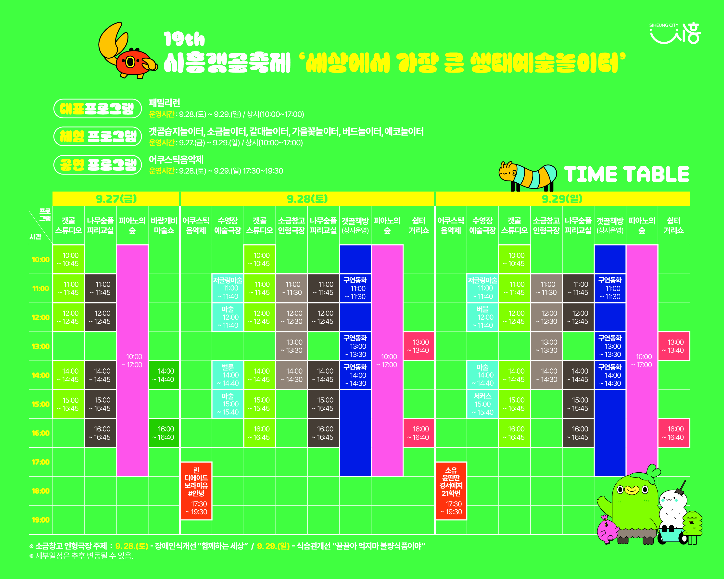 대한민국 대표 생태축제인 시흥갯골축제가 9월 27일부터 29일까지 3일간 시흥갯골생태공원에서 열린다. 시흥시는 19회째를 맞이하는 이번 축제의 성공적인 추진을 통해 내년 더 큰 도약을 준비한다는 방침이다.