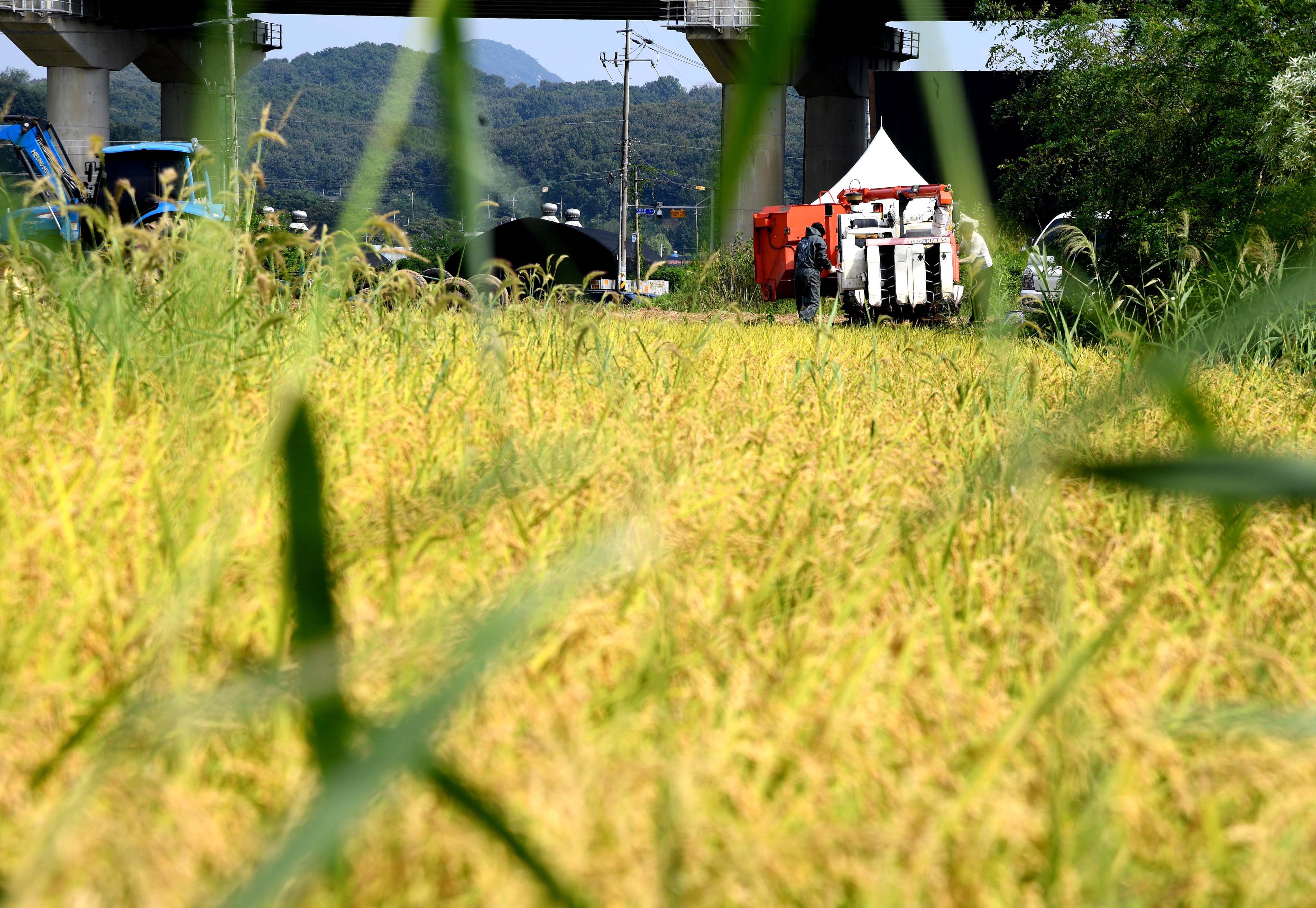푸른 논이 황금빛으로 물든 가을 초입, 알알이 영근 벼가 바람에 살랑이는 논에서 콤바인이 부지런히 쌀을 수확하고 있다. 황금빛 벼 사이를 지나가는 콤바인뒤로 가을의 풍요로움이 가득 채워진다.