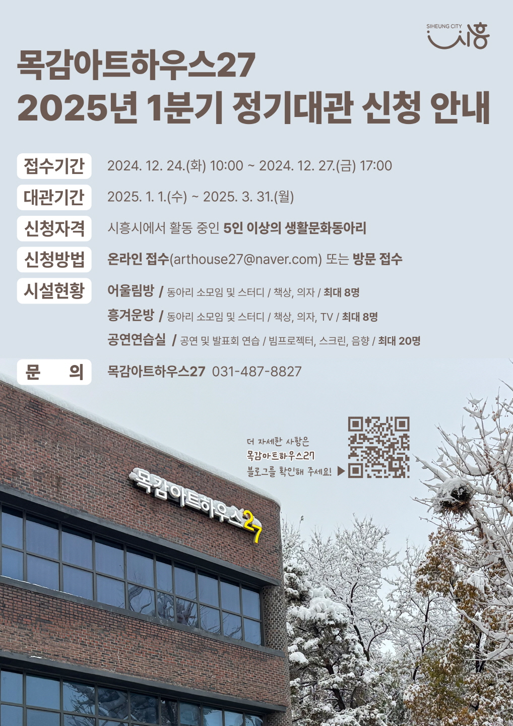 시흥시(시장 임병택)는 12월 24일 오전 10시부터 27일 오후 5시까지 목감아트하우스27에서 시흥시에서 활동 중인 생활문화동아리를 대상으로 ‘2025년 1분기 정기대관’ 신청을 받는다.