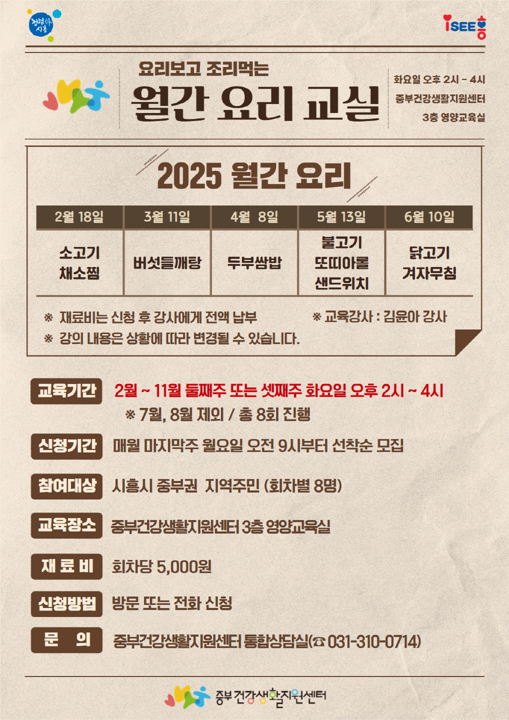 ‘요리 보고 조리 먹는 월간 요리 교실’은 매월 마지막 주 월요일 오전 9시부터 중부건강생활지원센터 통합건강상담실(031-310-0714)로 방문 또는 전화로 신청할 수 있다.