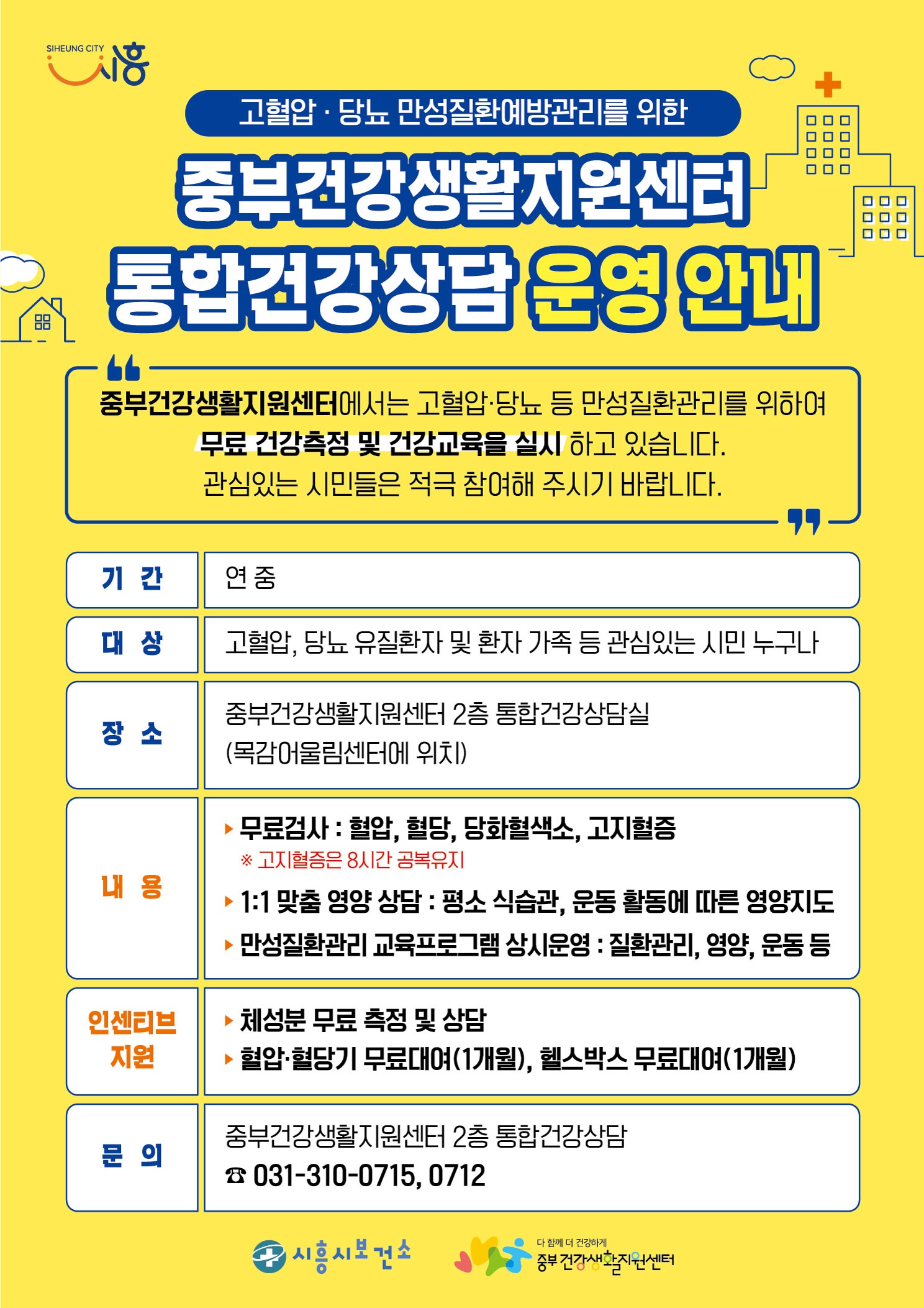궁금한 사항은 시흥시보건소 중부건강생활지원센터 통합건강상담실(031-310-0715)로 문의하면 된다.