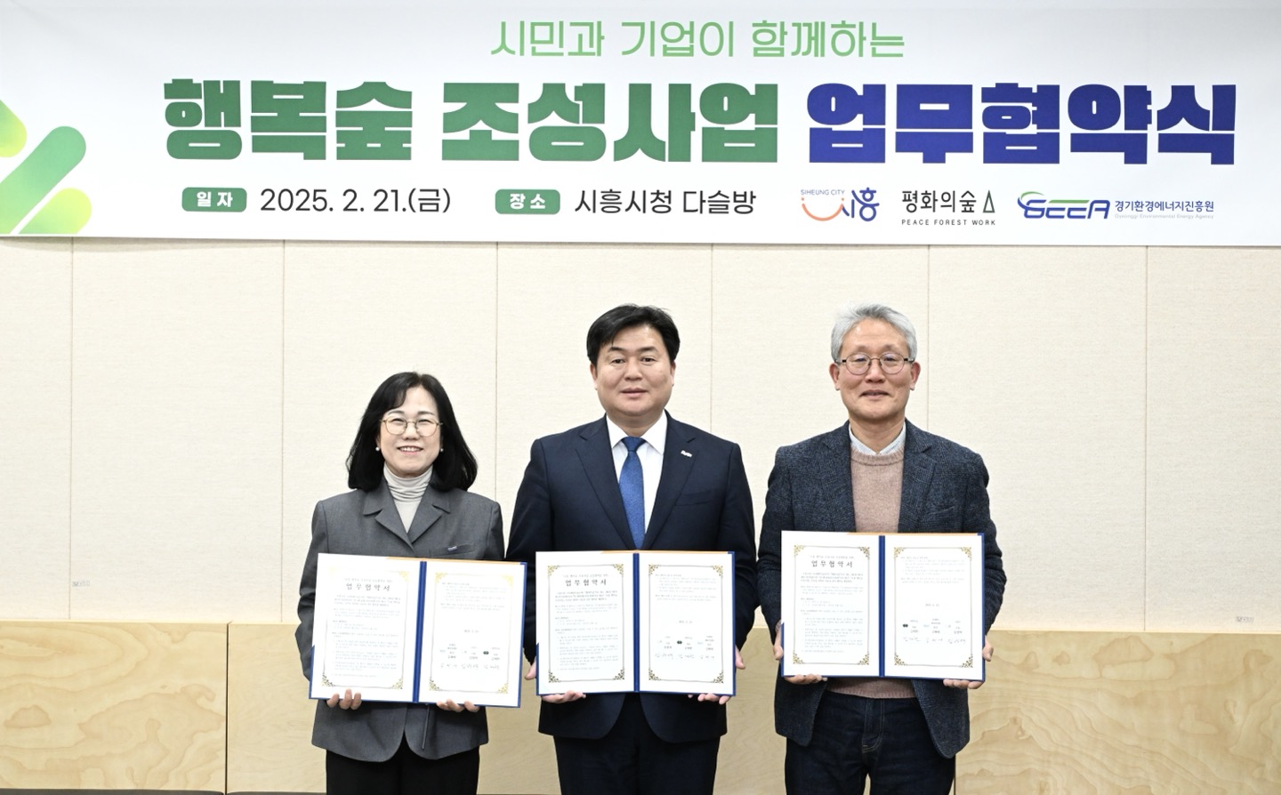 경기환경에너지진흥원(이하 진흥원)과 시흥시(시장 임병택), 평화의 숲(대표 김재현)은 21일, 시흥시청에서 ‘시흥 행복숲 조성’ 추진을 위한 업무협약(MOU)을 체결했다.