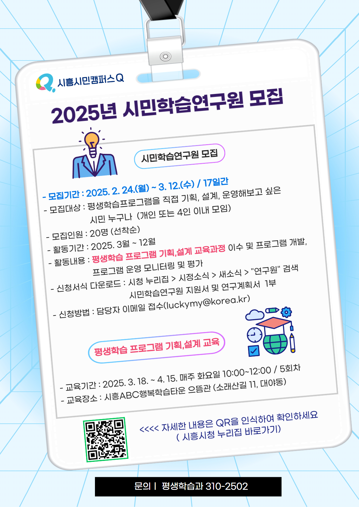 시흥시(시장 임병택)는 지속 가능한 평생학습 생태계 구축을 위해 시민이 주도적으로 평생학습 프로그램을 기획할 ‘시민학습연구원’을 3월 12일까지 모집한다.