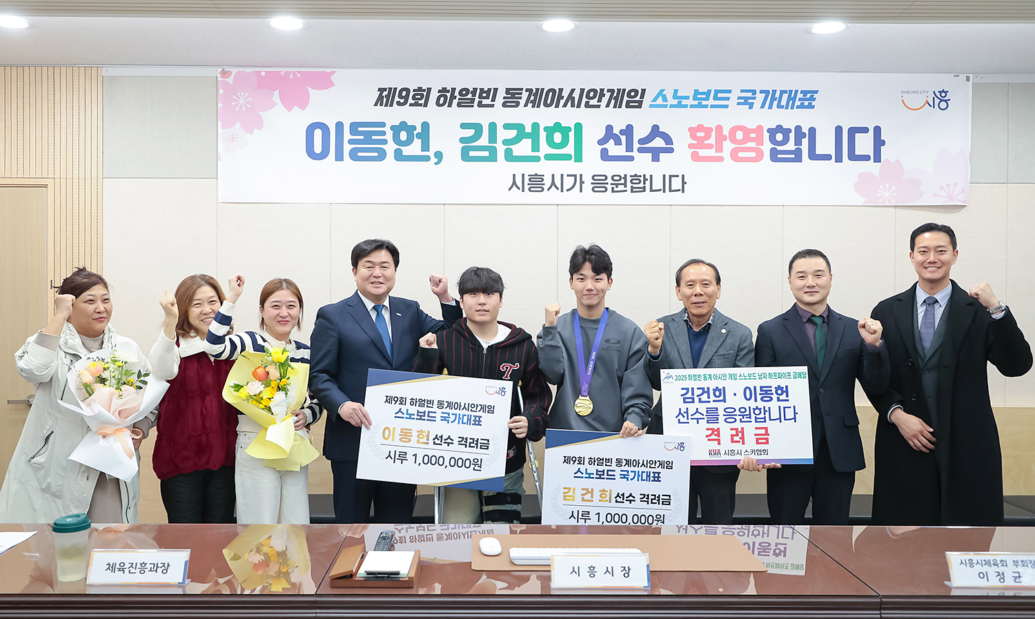 임병택 시흥시장이 28일, 제9회 중국 하얼빈 동계아시안게임 스노보드 국가대표 김건희ㆍ이동헌(매화고)에 격려금(각 100만 원)을 전달했다. 이날 전달식에는 김건희 선수와 이동헌 선수 그리고 두 선수의 부모님이 참석했다.
