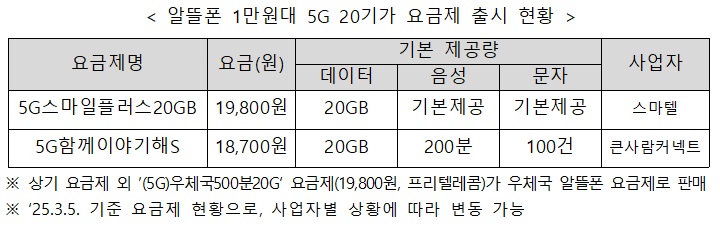 과학기술정보통신부는 알뜰폰 도매대가의 대폭 인하로 인해 데이터 20GB를 기본 제공하는 5G 요금제가 1만 8000원에서 1만 9000원대에 출시되고 있다고 3월 4일 밝혔다.