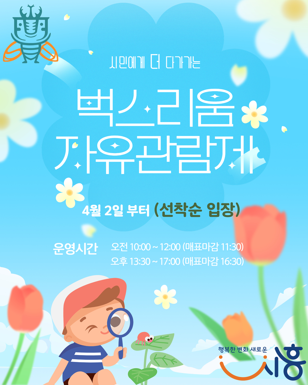 시흥시(시장 임병택)가 오는 4월 2일부터 곤충전시체험관인 ‘벅스리움’ 운영 방식을 사전 예약제에서 선착순 현장 방문(자유 관람) 방식으로 변경한다.