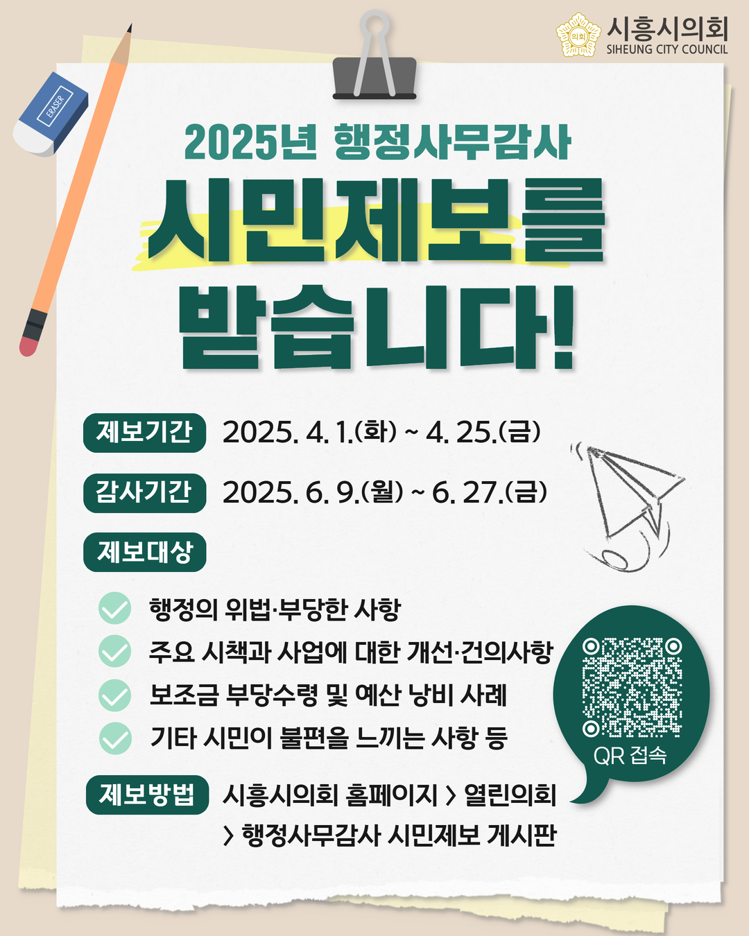 경기 시흥시의회(의장 오인열)가 오는 4월 1일부터 행정사무감사에 대한 시민제보를 받기 시작한다.