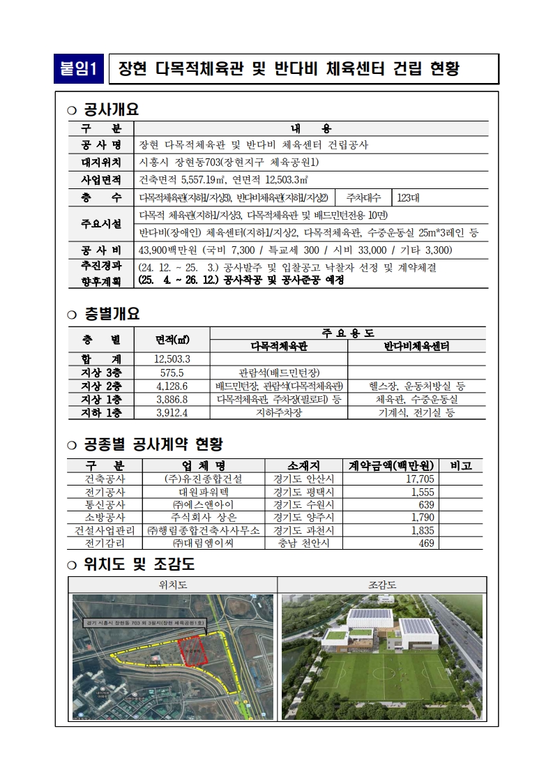 장현 다목적체육관 및 반다비 체육센터 건립에는 사업비 총 439억 원이 투입되며, 오는 2026년 말 준공을 목표로 진행된다.