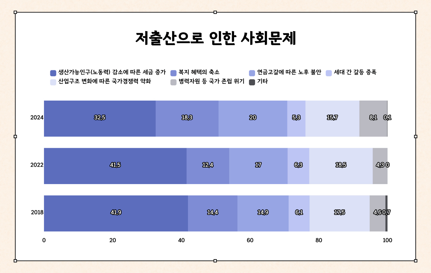 시민들의 저출산에 따른 사회적 우려는 ‘세금 증가’(32.5%)가 가장 높았고, ‘연금 고갈’(20.0%)과 ‘복지 혜택 축소’(18.3%)에 대한 불안도 꾸준히 증가하는 추세다. 특히 연금 고갈 우려는 2018년 14.9%, 2022년 17.0%에서 2024년 20.0%로 상승했으며, 복지 축소에 대한 걱정도 같은 기간 12.4%에서 18.3%로 증가했다. 시는 이러한 결과를 토대로 고령사회에 대비한 복지 및 정책 설계의 필요성을 강조하고 있다.