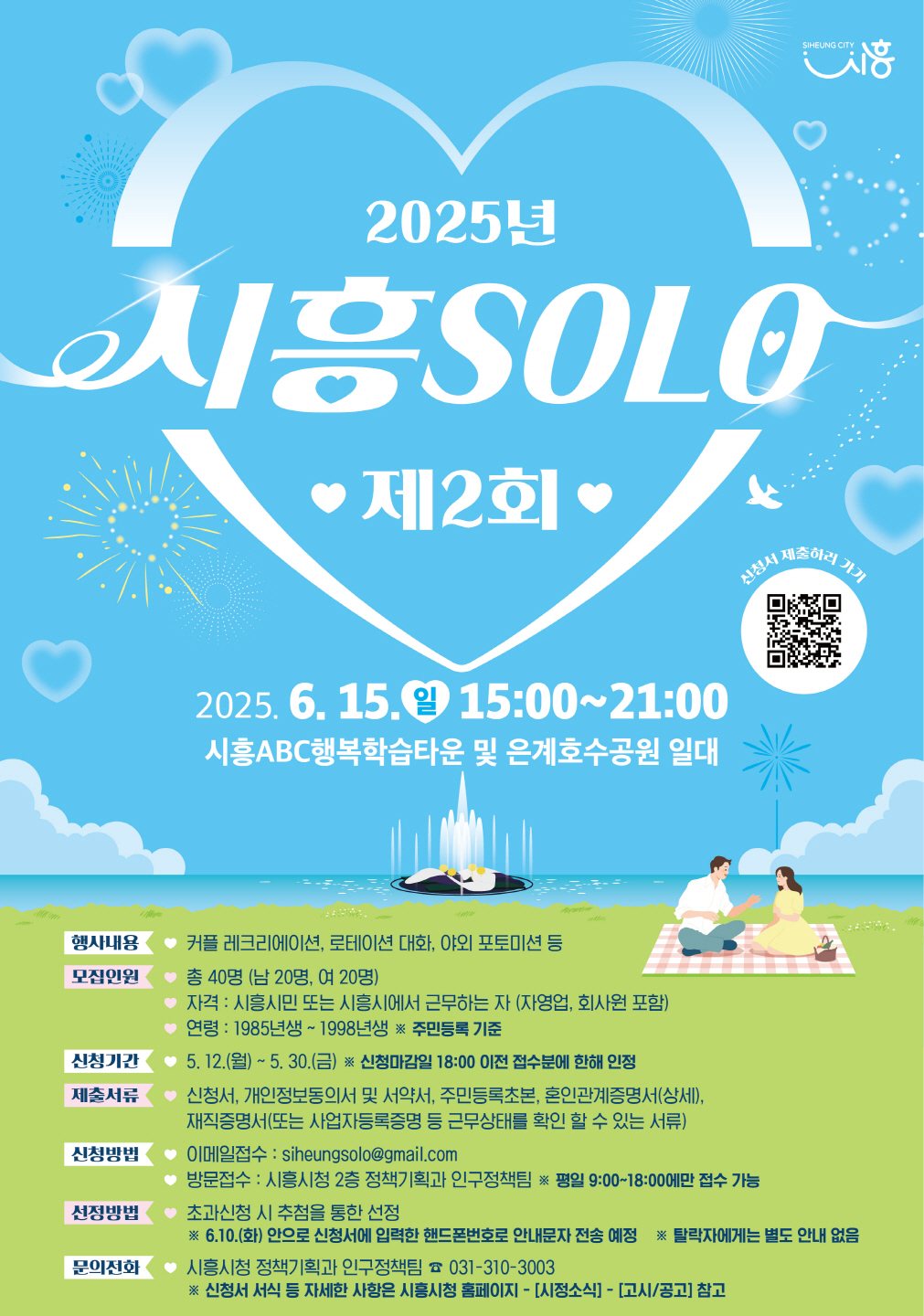 시흥시(시장 임병택)는 청춘남녀들에게 소중한 인연을 만날 기회를 제공하고 결혼 친화 분위기를 조성하기 위해 ‘2025년 제2회 시흥 솔로(SOLO)’ 행사를 개최하고 미혼남녀 참가자를 5월 말까지 모집한다.