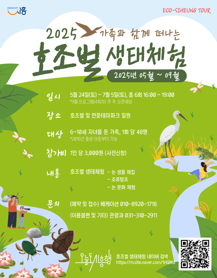 가을까지 이어지는 생태관광 체험프로그램의 세부 일정과 내용은 시흥시 블로그 및 누리소통망을 통해 확인할 수 있으며, 관련 문의는 시흥시청 관광과(031-310-2911)로 하면 된다.