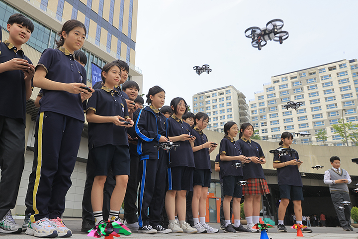 지난달 14일 서울 강서구 마곡동 코엑스 마곡에서 열린 '드론산업 얼라이언스 창립총회'에서 학생들이 드론비행 체험을 하고 있다.(사진=저작권자(c) 연합뉴스)