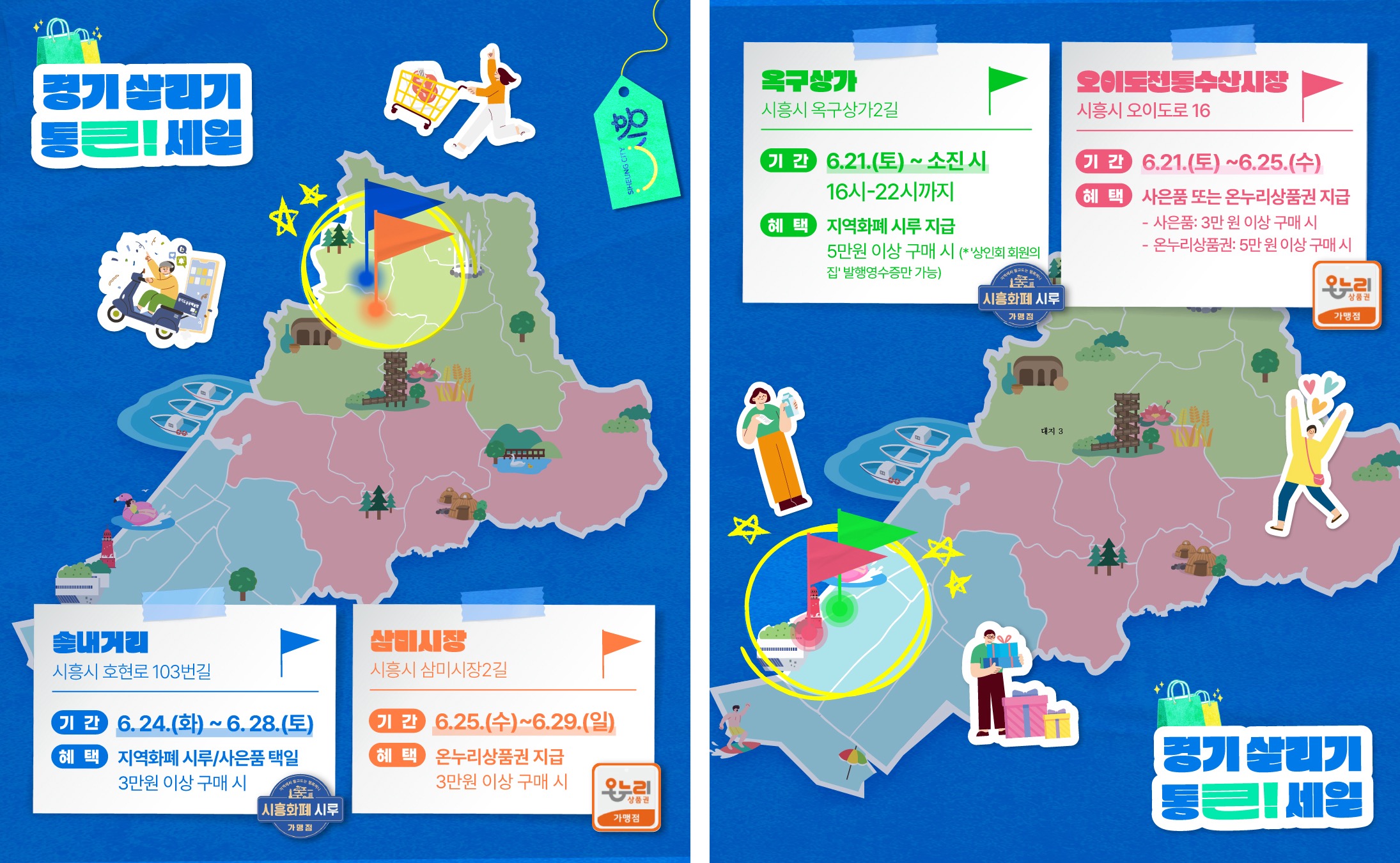 이번 행사는 경기도와 경기도시장상권진흥원이 공동 추진하며, 시흥시에서는 ▲삼미시장 ▲오이도전통수산시장 ▲옥구상가 ▲솔내거리 등 4개 상권이 참여한다. 행사 기간 해당 상권에서 일정 금액 이상을 구매한 소비자는 온누리상품권 또는 시루(지역화폐), 사은품 등 다양한 혜택을 제공받을 수 있다.