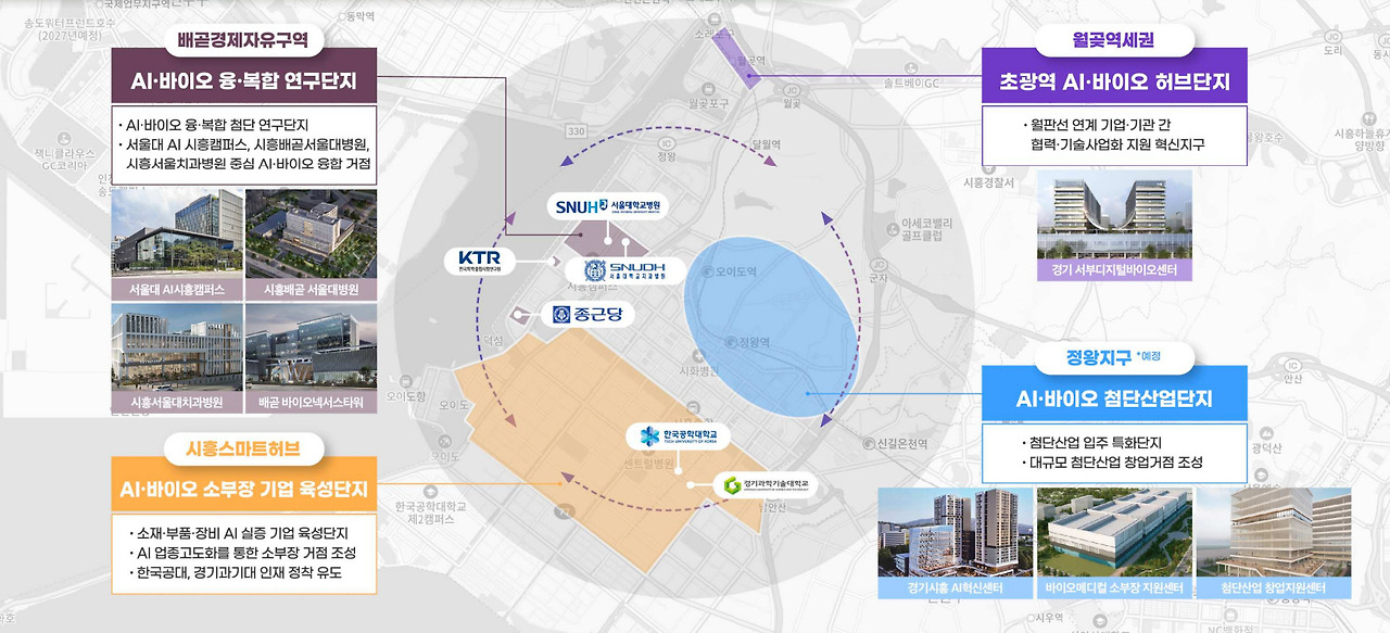 특히 향후 정왕지구와 월곶역세권 일대는 R&D 중심의 첨단기업과 스타트업 유치를 가속화하는 발판이 될 것으로 기대된다. 두 지역은 교통 접근성과 배곧지구와의 연계성이 뛰어나, 연구기관·생산시설·창업공간이 유기적으로 연결된 바이오산업 허브로서 발전 가능성이 높다. 시는 단계별 기반시설 확충과 부지 공급을 통해 바이오 기업의 집적을 유도하고, 정주환경과 인프라를 동시에 갖춘 미래형 산업거점으로 탈바꿈시켜 나갈 계획이다.