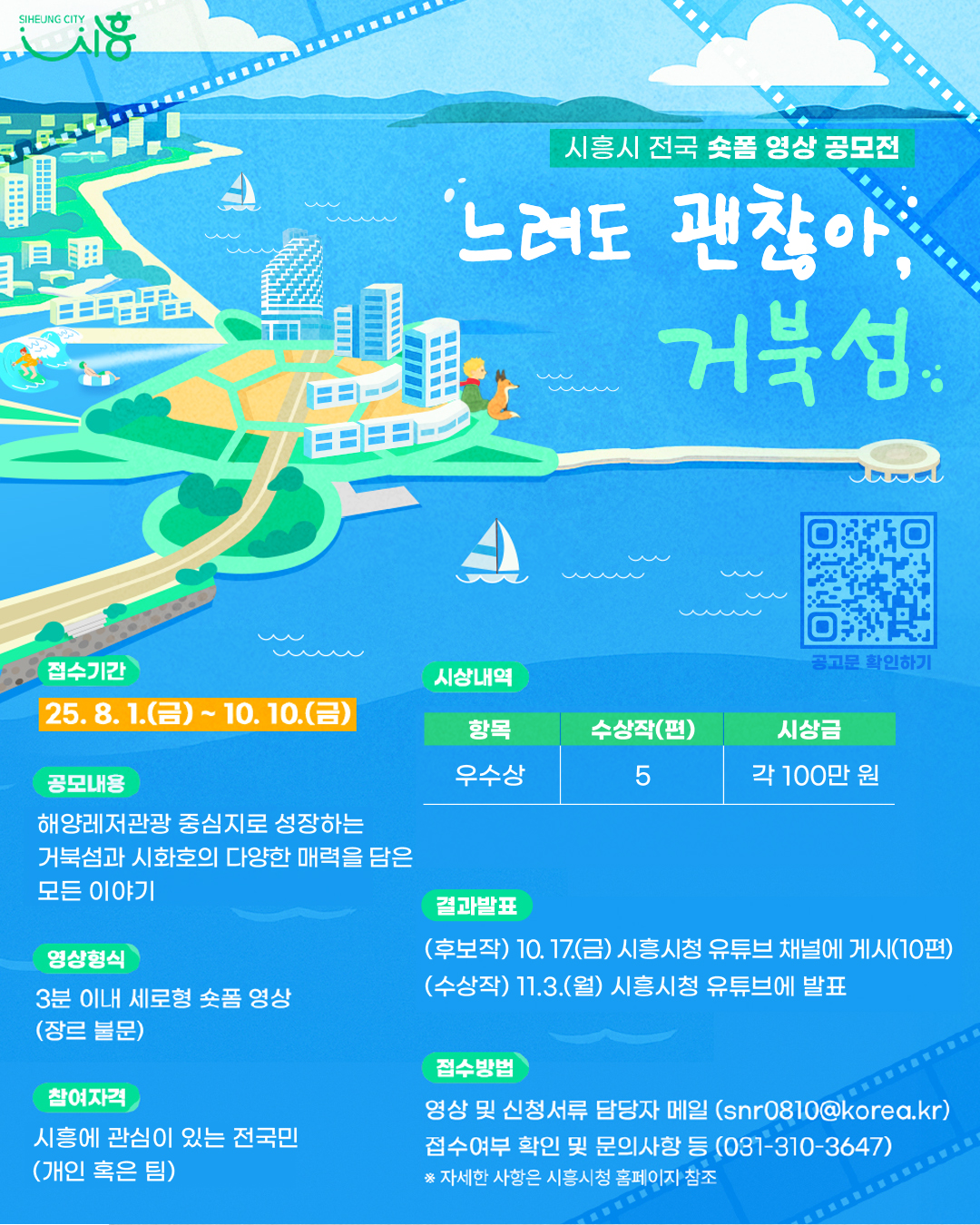 시흥에 관심 있는 국민과 등록외국인 누구나 개인 또는 팀으로 공모에 참여할 수 있다. 출품작은 숏드라마, 뮤직비디오, 브이로그, 패러디, 애니메이션, 댄스, 코미디 등 형식에 제한이 없으며, 3분 이내 분량의 세로형 영상으로 자유롭게 담으면 된다.