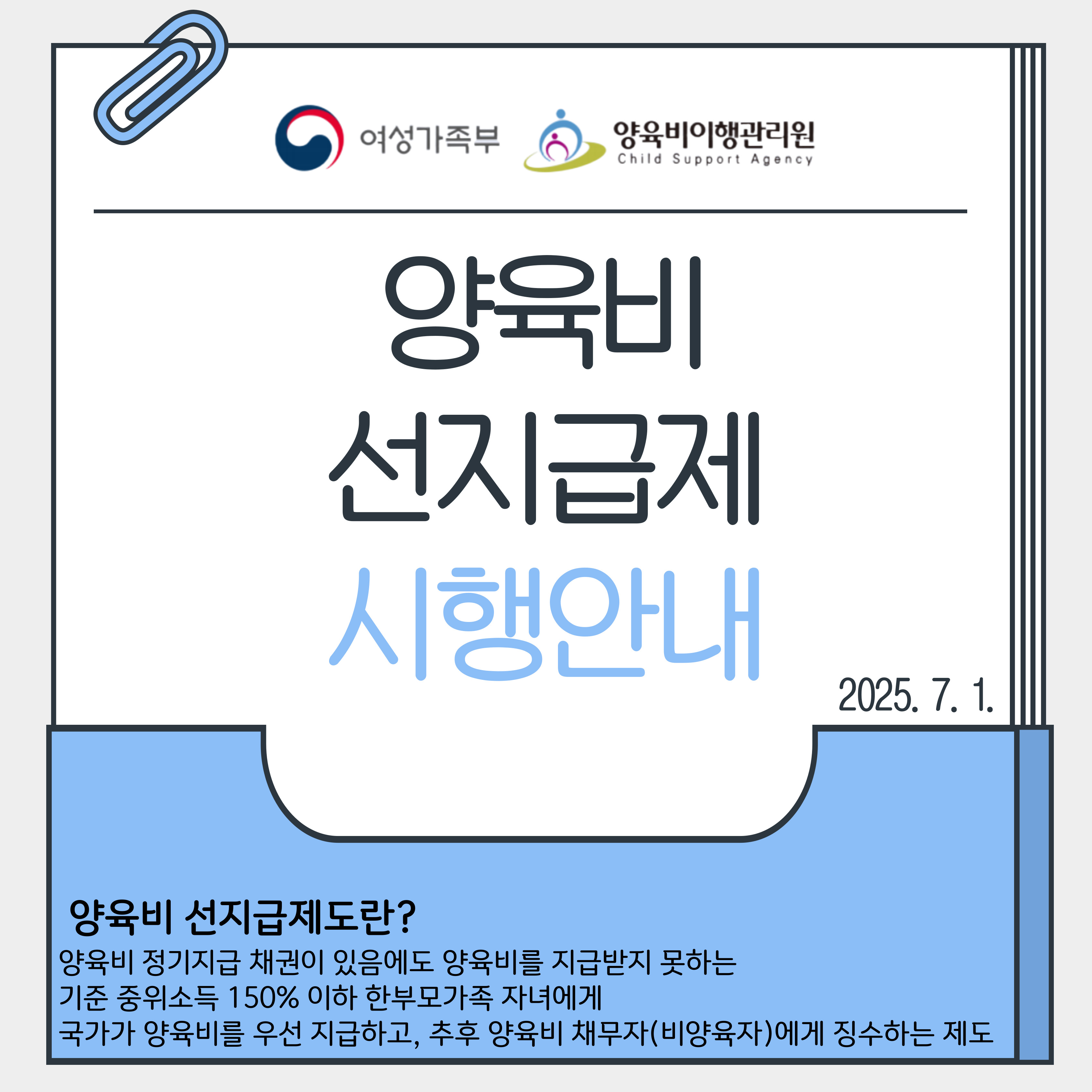 비양육 부모로부터 양육비를 받을 권리가 있음에도 지급받지 못하는 한부모 가정의 자녀에게 국가가 먼저 양육비를 지급하고, 이후 비양육 부모에게 회수하는 ‘양육비 선지급제’가 지난 7월부터 시행되고 있다.