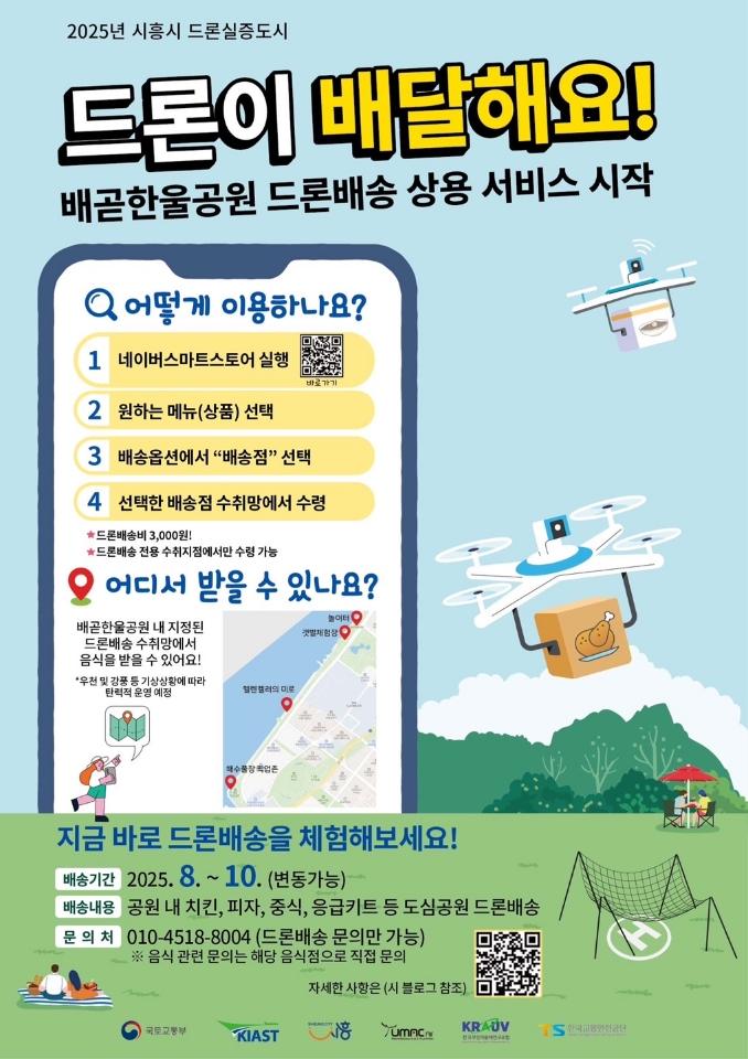 시흥시(시장 임병택)가 국토교통부 ‘2025 드론 실증도시 구축사업’ 공모에 선정돼, 이달부터 10월 말까지 배곧한울공원 일대에서 드론을 활용한 배송 실증사업에 본격 착수한다. 이번 사업은 시흥시가 국비 5억 원을 확보해 추진하는 드론배송 상용화 사업으로, 공원을 찾는 시민들이 드론으로 배달되는 음식을 직접 받아볼 수 있는 체감형 서비스다.