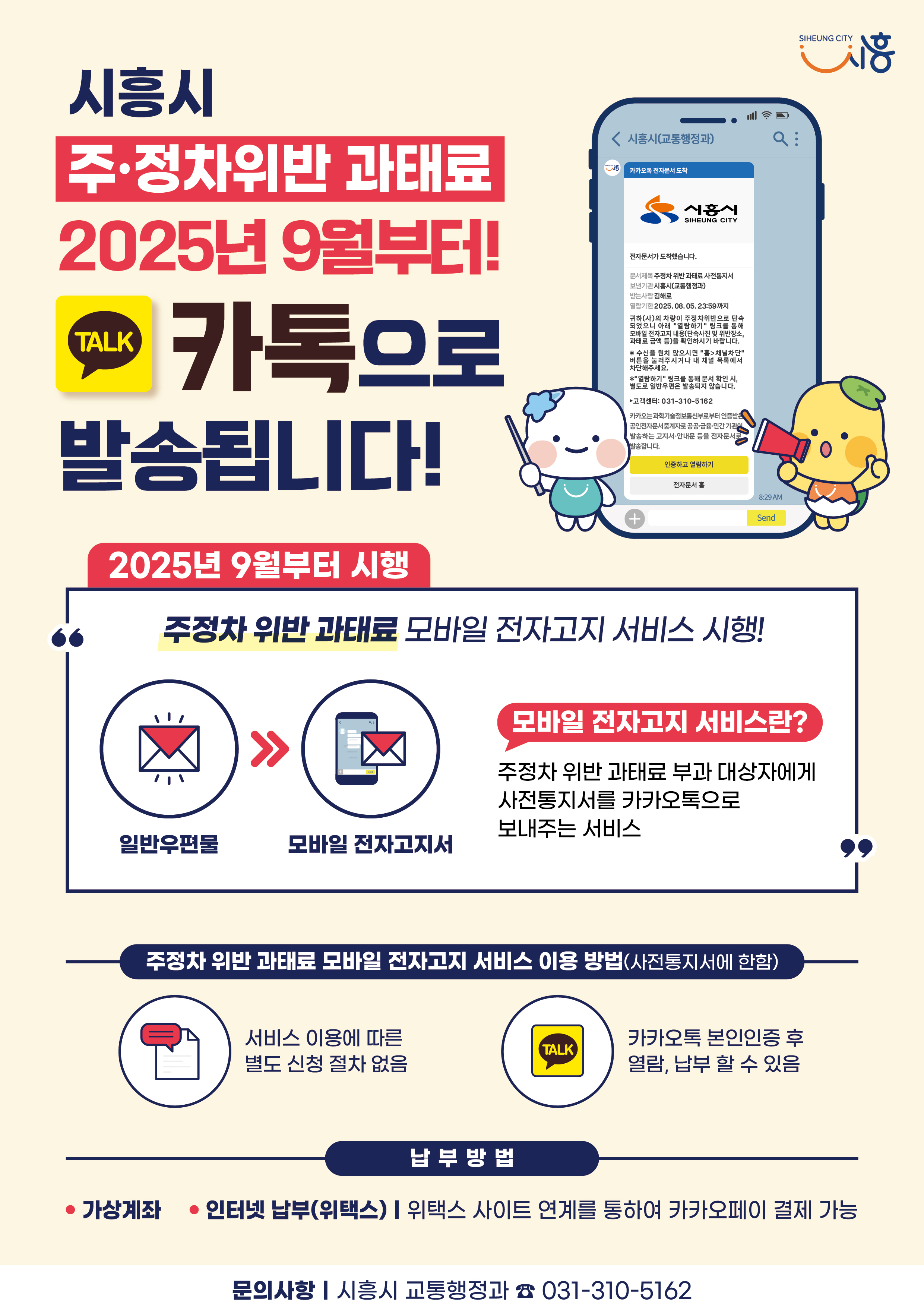 시흥시(시장 임병택)는 오는 9월부터 ‘주정차 위반 과태료’ 고지서를 전자문서(카카오톡)로 발송하는 ‘모바일 전자고지 서비스’를 정식으로 운영한다.