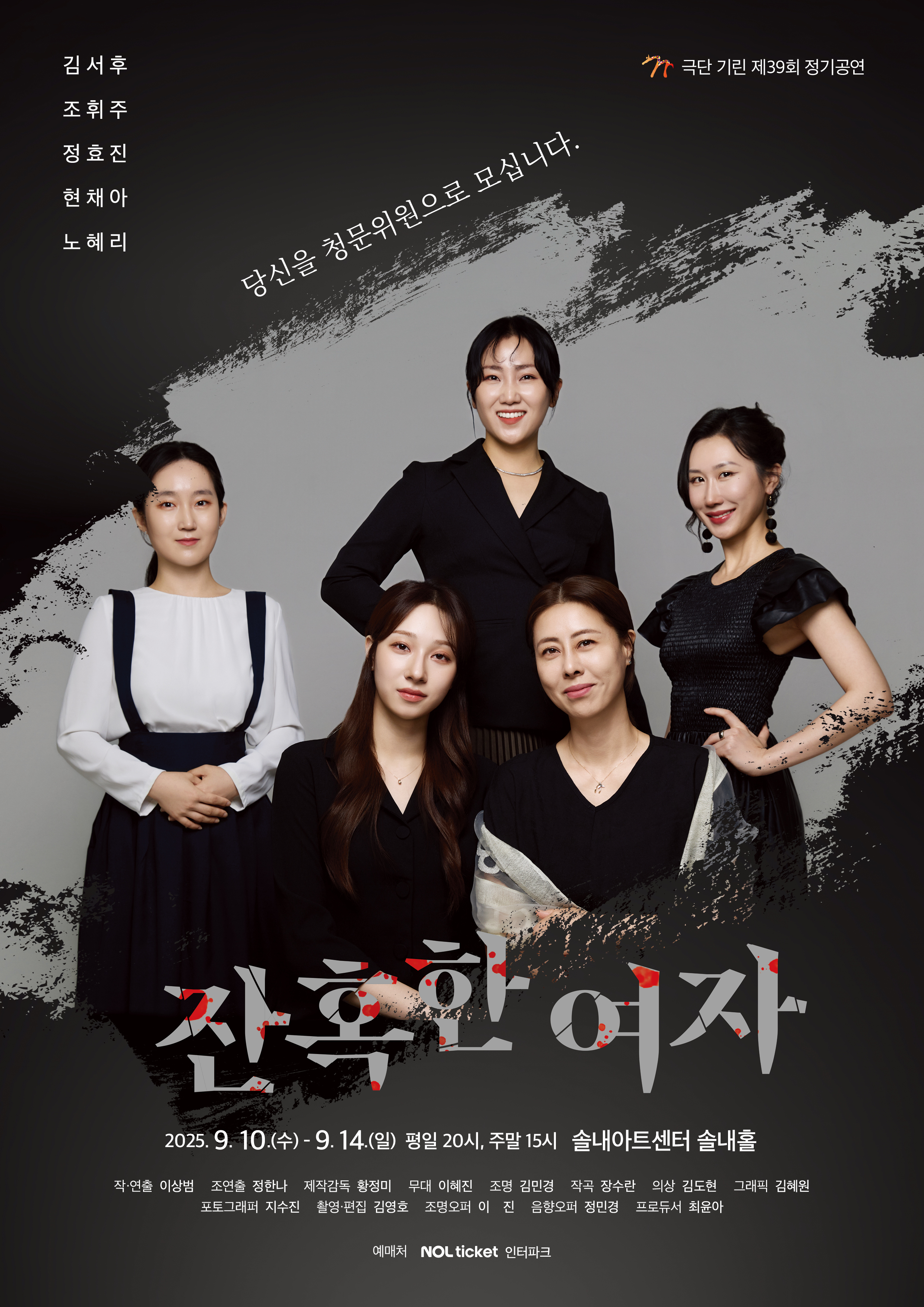 2025년 9월 10일부터 14일까지 공연하는 이번 작품은 평일은 오후 8주말에는 오후 3시에 솔내아트센터 솔내홀에서 막을 올린다이번 공연은 전석 2만원인터파크에서 티켓을 판매한다관람을 원하는 시민은 인터파크에서 <잔혹한 여자>를 검색해 예매하거나 극단 기획(010-4874-3371)에 전화해 사전 관람 예약하면 된다. <잔혹한 여자>는 2025년 시흥시 문화예술지원사업 지원금으로 제작한다.