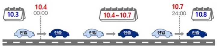 통행료 면제 기간 및 대상은 10월 4일(토) 00시부터 10월 7일(화) 24시까지 잠시라도 고속도로를 이용하는 차량에 적용된다.