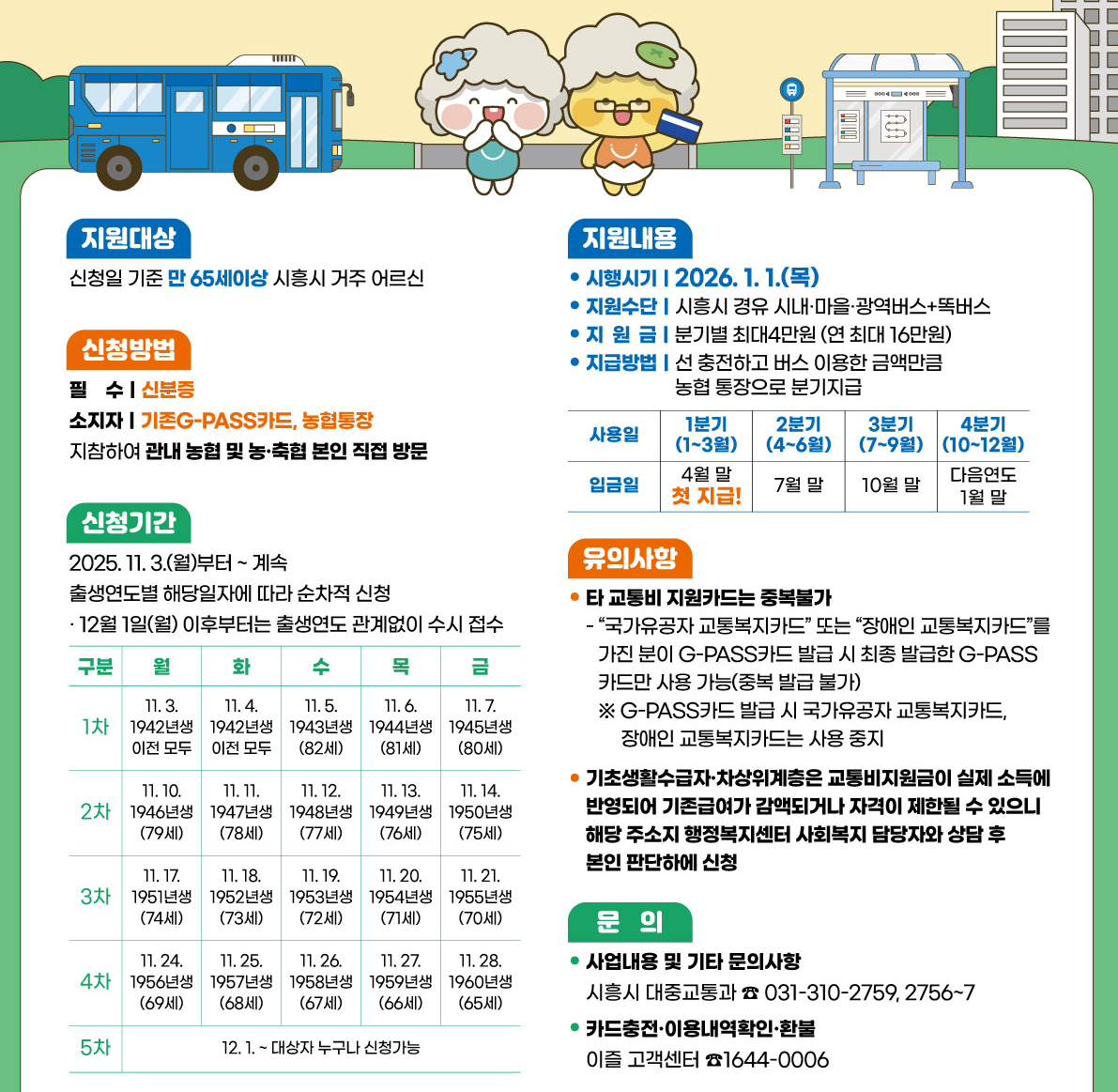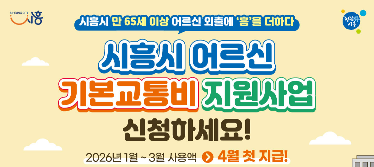 이번 사업은 시흥시에 거주하는 만 65세 이상 어르신들에게 실제 사용한 교통비를 분기별로 최대 4만 원(연 최대 16만 원)을 지원한다. 사전 신청은 오는 11월 3일부터 시작되며, 2026년 1월 1일 이후 사용분부터 적용해 같은 해 4월 말 첫 지급이 이뤄질 예정이다.