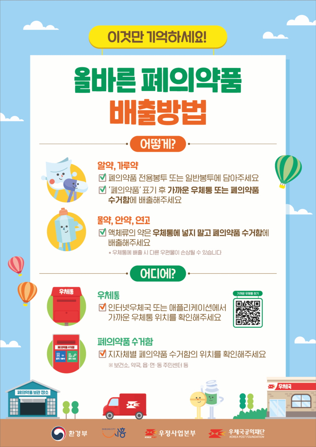 가정에서 발생한 폐의약품은 회수 봉투나 일반 편지 봉투에 ‘폐의약품’이라고 표시해 밀봉한 후 가까운 우체통에 넣으면 된다. 우체국이 이를 회수해 시흥시청에 전달하면 안전하게 처리된다. 다만, 액상 의약품은 우편물 훼손 우려가 있어 기존 보건소나 행정복지센터 전용 수거함을 이용해야 한다.