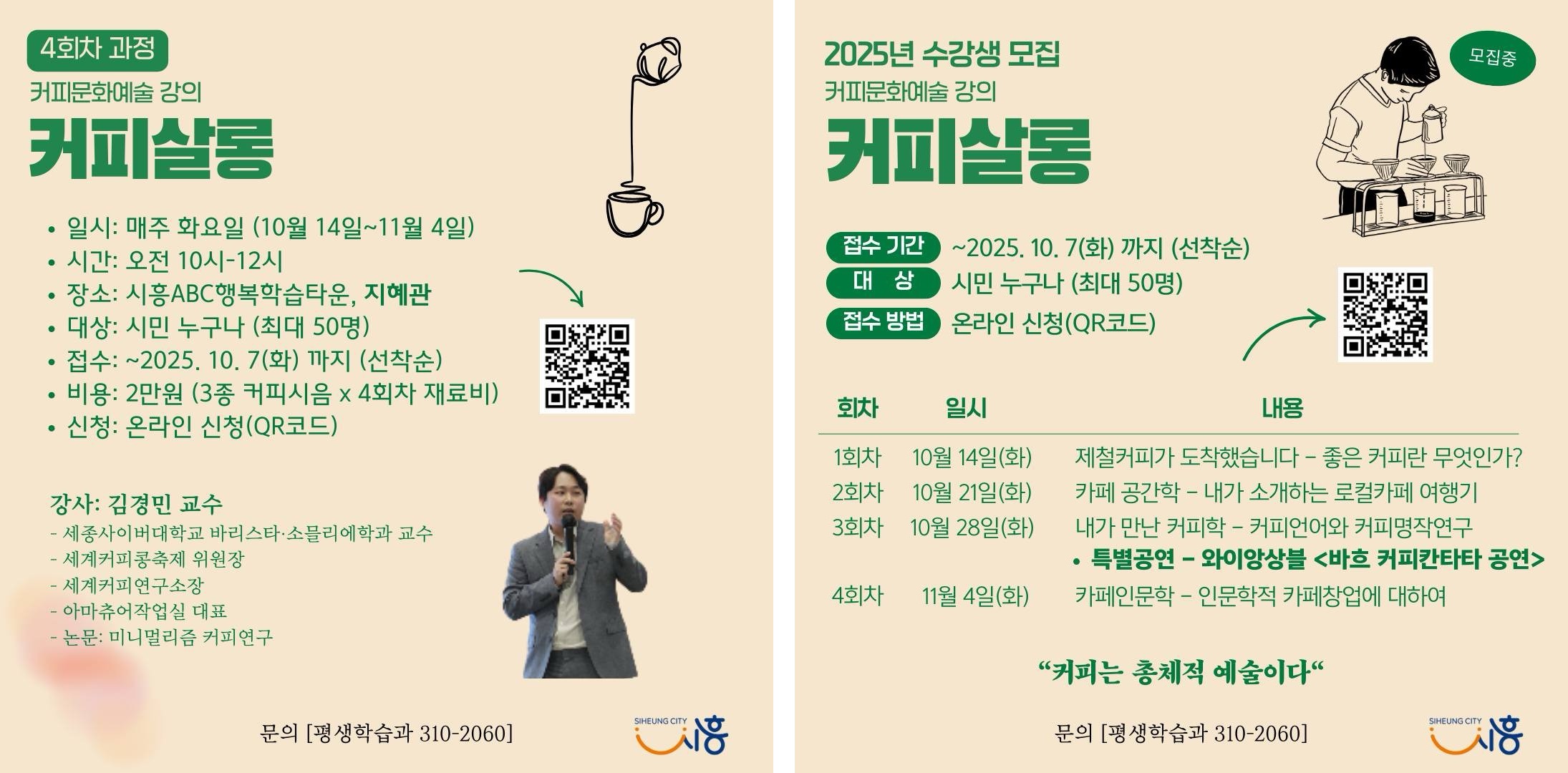 시흥시(시장 임병택)는 민간주도형 지역축제 지원사업인 ‘2025년 시흥시 지역특화 관광축제 지원사업’에 선정된 ‘세계 커피콩 축제’의 사전 연계 프로그램으로 커피문화예술 특강 ‘커피살롱’을 오는 10월 14일부터 11월 4일까지 시흥ABC행복학습타운 지혜관에서 총 4회에 걸쳐 진행한다.