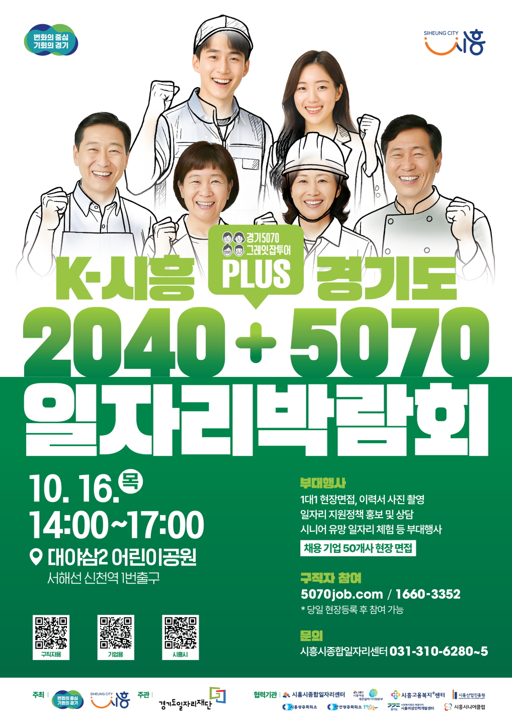 시흥시(시장 임병택)는 경기도 및 경기도일자리재단과 함께 ‘2025년 K-시흥 2040 플러스 경기도 5070 일자리박람회’를 오는 10월 16일 오후 2시부터 5시까지 대야삼2어린이공원(서해선 신천역 1번 출구 앞)에서 개최한다.