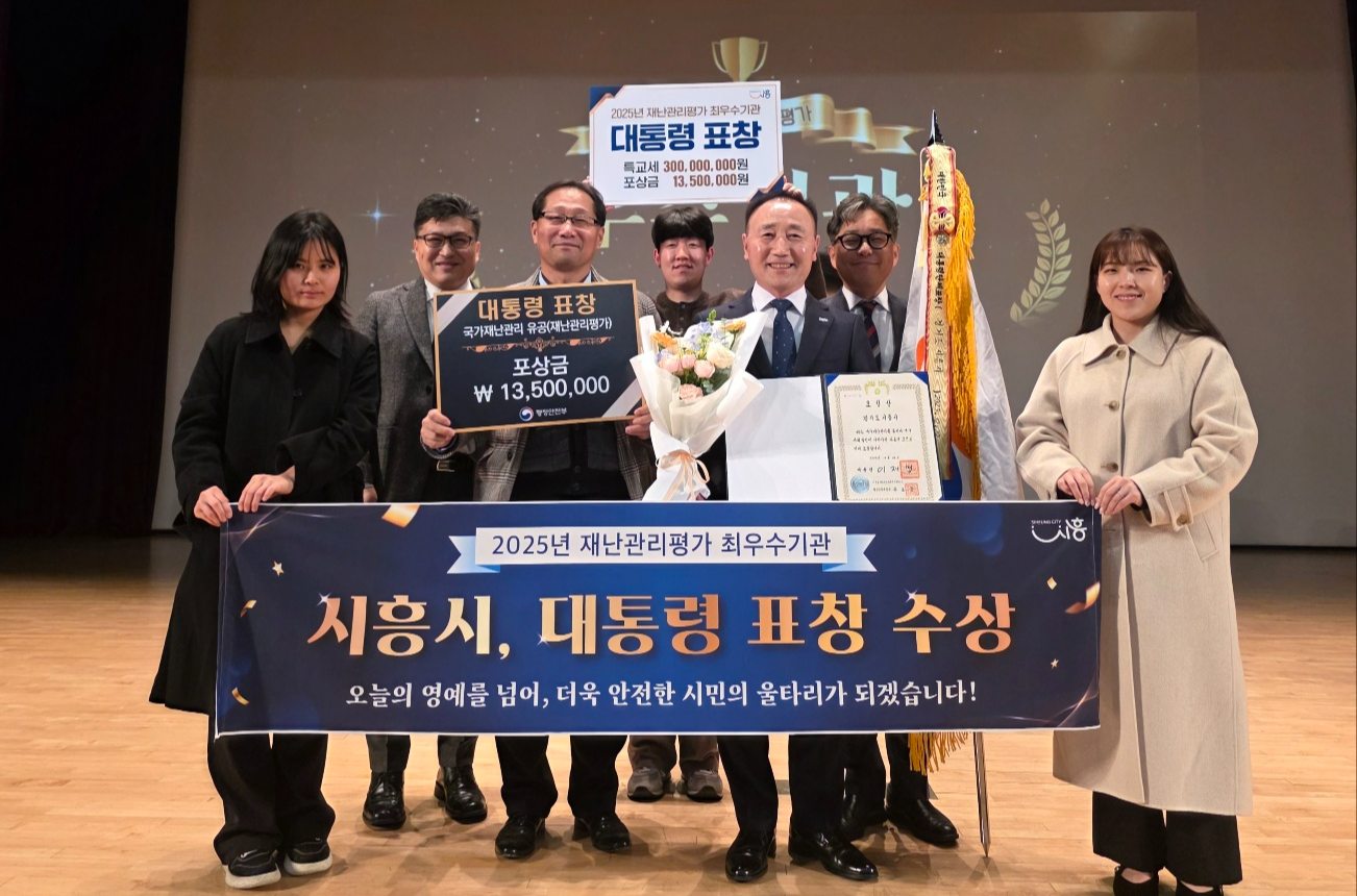 시흥시(시장 임병택)는 행정안전부가 주관한 ‘2025년 재난관리평가’에서 최우수기관으로 선정돼 지난 12월 22일 정부세종청사 국토교통부 대강당에서 열린 시상식에서 대통령 표창을 받고 특별교부세 3억 원과 포상금 1,350만 원을 확보했다.