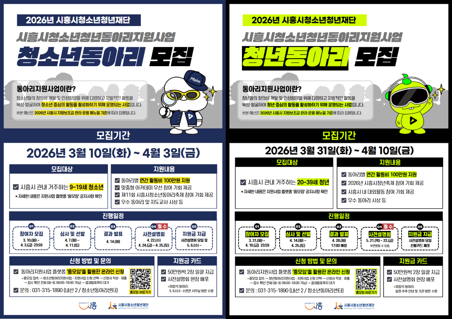 2026년 시흥시 청소년·청년 동아리 지원사업 신청은 3월 10일 오전 10시부터 흥모임 플랫폼을 통해 가능하며자세한 사항은 플랫폼 공지사항의 안내문을 통해 확인할 수 있다사업 관련 문의는 시흥시청소년수련관 청소년동아리센터(031-315-1890(내선2))로 하면 된다.