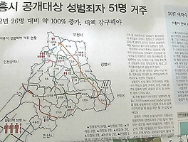 “시흥시 성범죄자 현재 51명, 정왕동 33명 중 대부분 본동, 정왕1동에 몰려 있어” 시흥자치신문이 2016년 현재 시흥시 성범죄자 수가 51명이라고 밝혔다(16.11.11 제731호). 2012년 26명이었던 것에 비하면 두배 가까이 증가한 셈이다. 지역별로 살펴 보면 정왕동이 33명, 신천동 7명, 대야동 2명, 과림동 1명, 매화동 2명, 도창동 1명, 능곡동 2명, 은행동 1명이었다. 이 조사는 법무부와 여성가족부 ‘성범죄자 알림e'사이트(www.sexoffender.go.kr)에서 집계된 수치다. 한편, 전국적으로 신상이 공개된 성범죄자의 총 인원수 4,407명, 서울 734명, 경기도 1,028명, 경기도 내 1위 수원시 96명, 부천 89명, 안산 68명, 의정부 65명, 시흥시 51명 순..